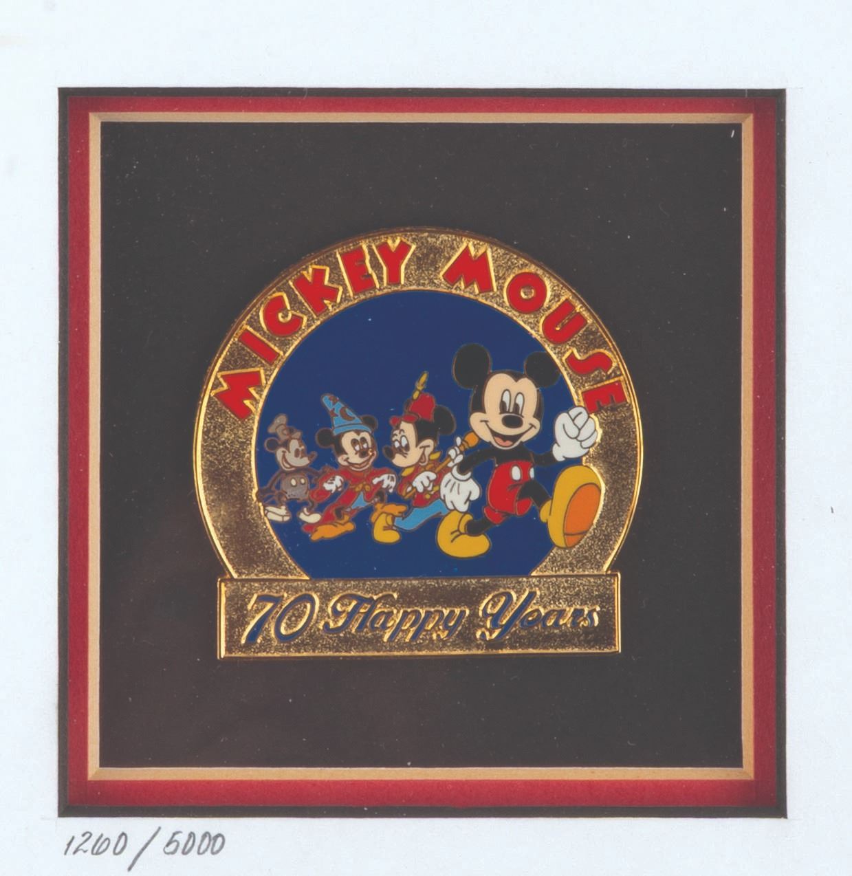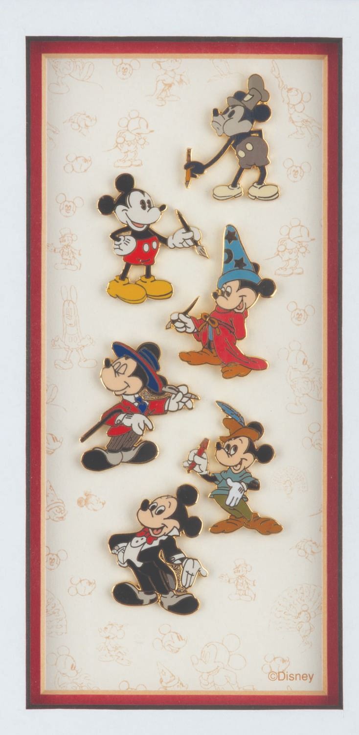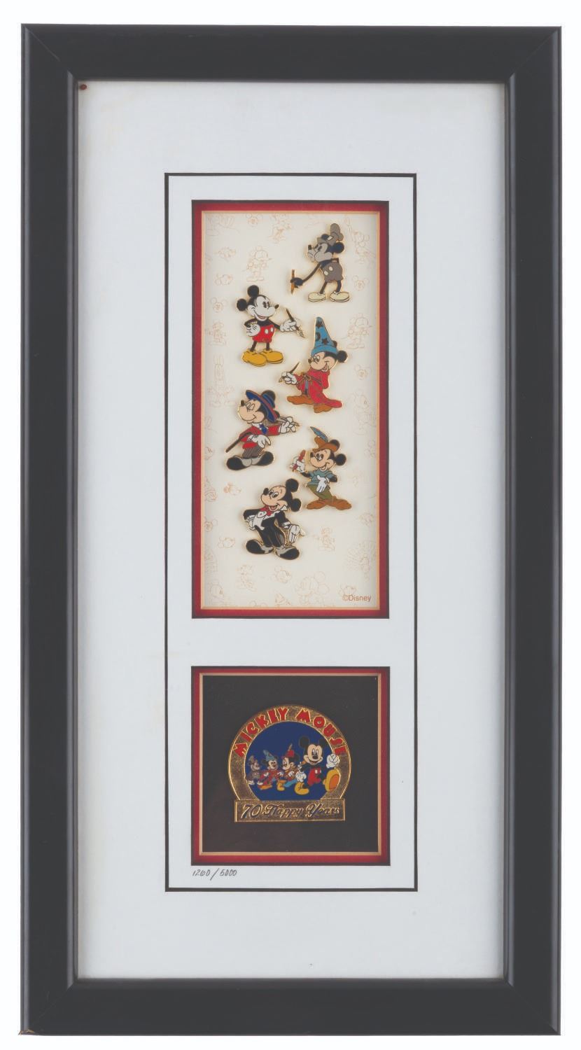 (Disney, 1998) A framed pin set celebrating 70 years of Mickey Mouse, numbered 1260 of a limited edition of 5000. Ranging in size from 1.25” x 1.5” x to 2.75” x 2.75”, the pins are in fine condition, while the 10” x 18.5” frame is in good condition with scratches, scuffs, and wear.