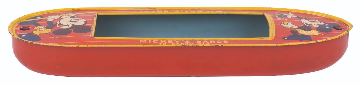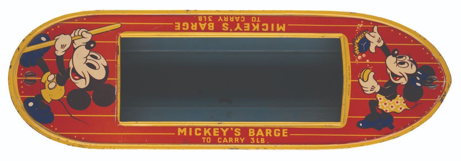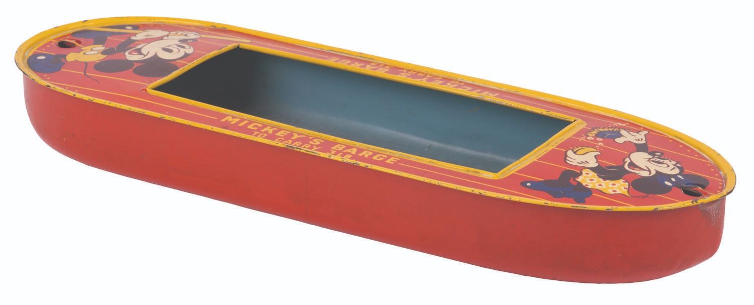 (Happynak Toy, 1950s) A tin toy Mickey Mouse barge produced by Happynak Toy of England. Measuring 5" x 16" x 1.75" high, the toy is in very good condition, with light wear including scuffs and scratches, mainly to its edges.
