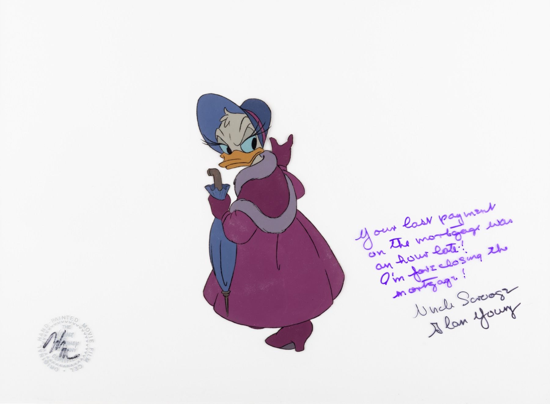 (Disney, 1983) An original hand-painted production cel of Daisy from "Mickey's Christmas Carol." The voice of Uncle Scrooge, Alan Young, signed the piece in black marker and wrote a quote from the film in purple marker. With a character image size of 4.25" x 6.75" in a 16" x 20" matte, the art displays in very good condition with scratches and light wear.