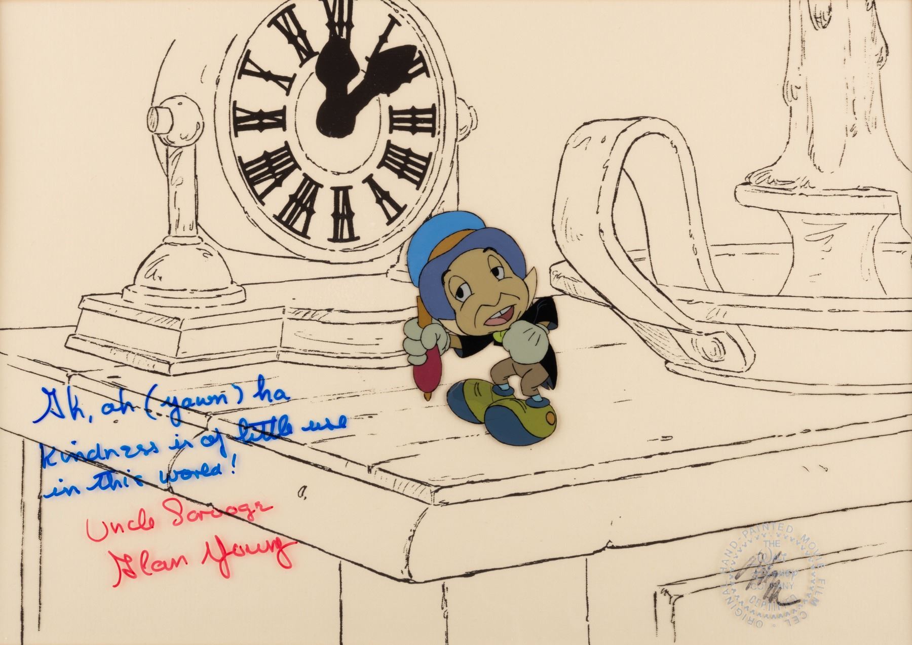 (Disney, 1983) An original production cel of Jiminy Cricket as The Ghost of Christmas Past from "Mickey's Christmas Carol," signed by Alan Young who voiced "Scrooge." The character image measures 3.5" x 2.25" on a cel with 9.5" x 13.75" visible in a 16" x 20" matte. The cel is paired with a screen-matching background established in line work on a secondary cel. The piece displays in very good condition, with slight paint separation and a fine crack in the paint on Jiminy's shoe.