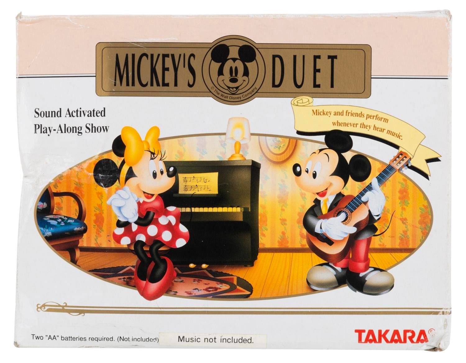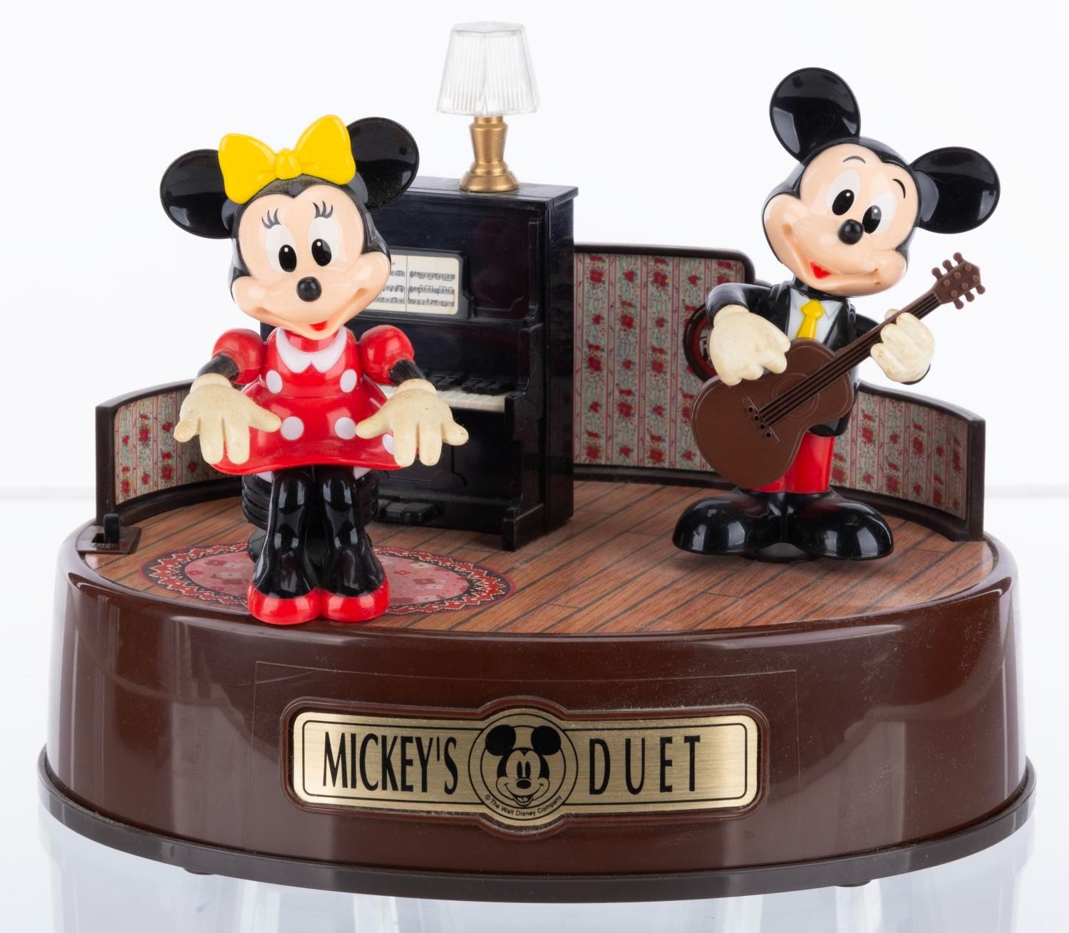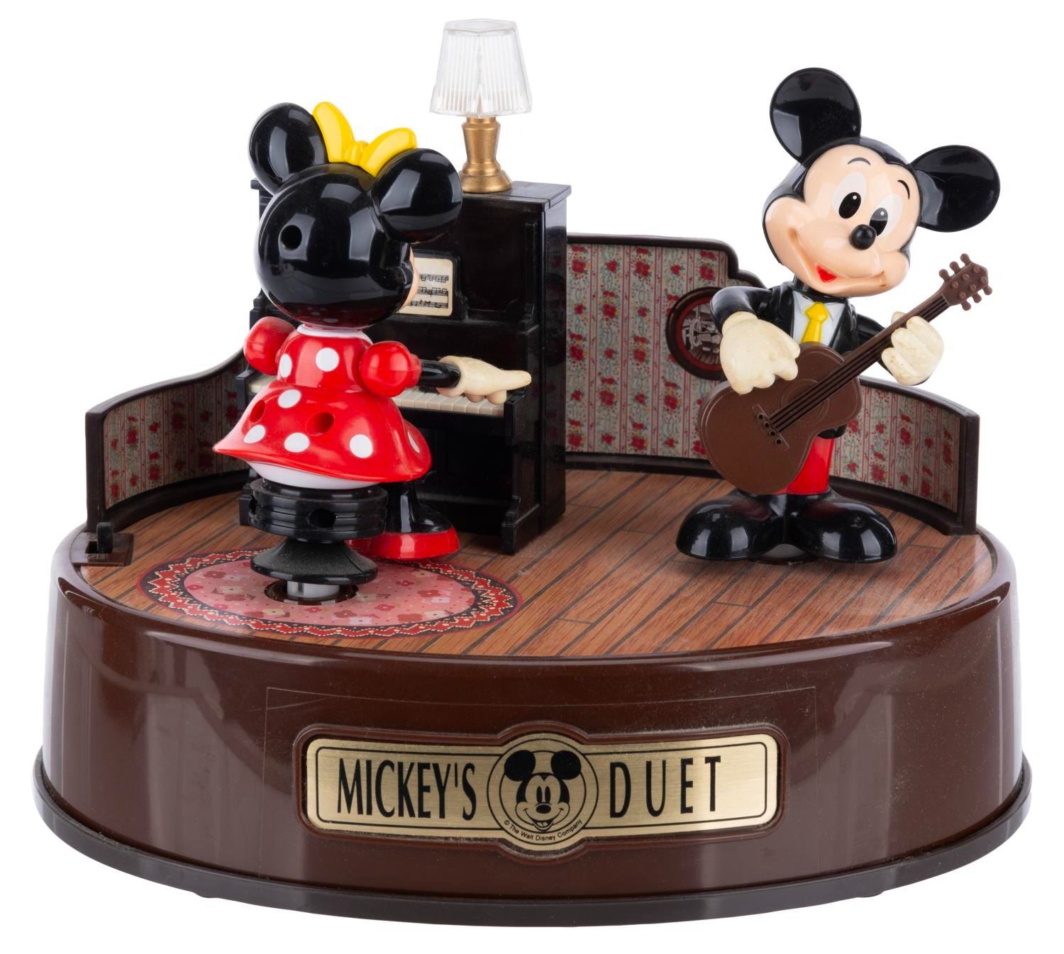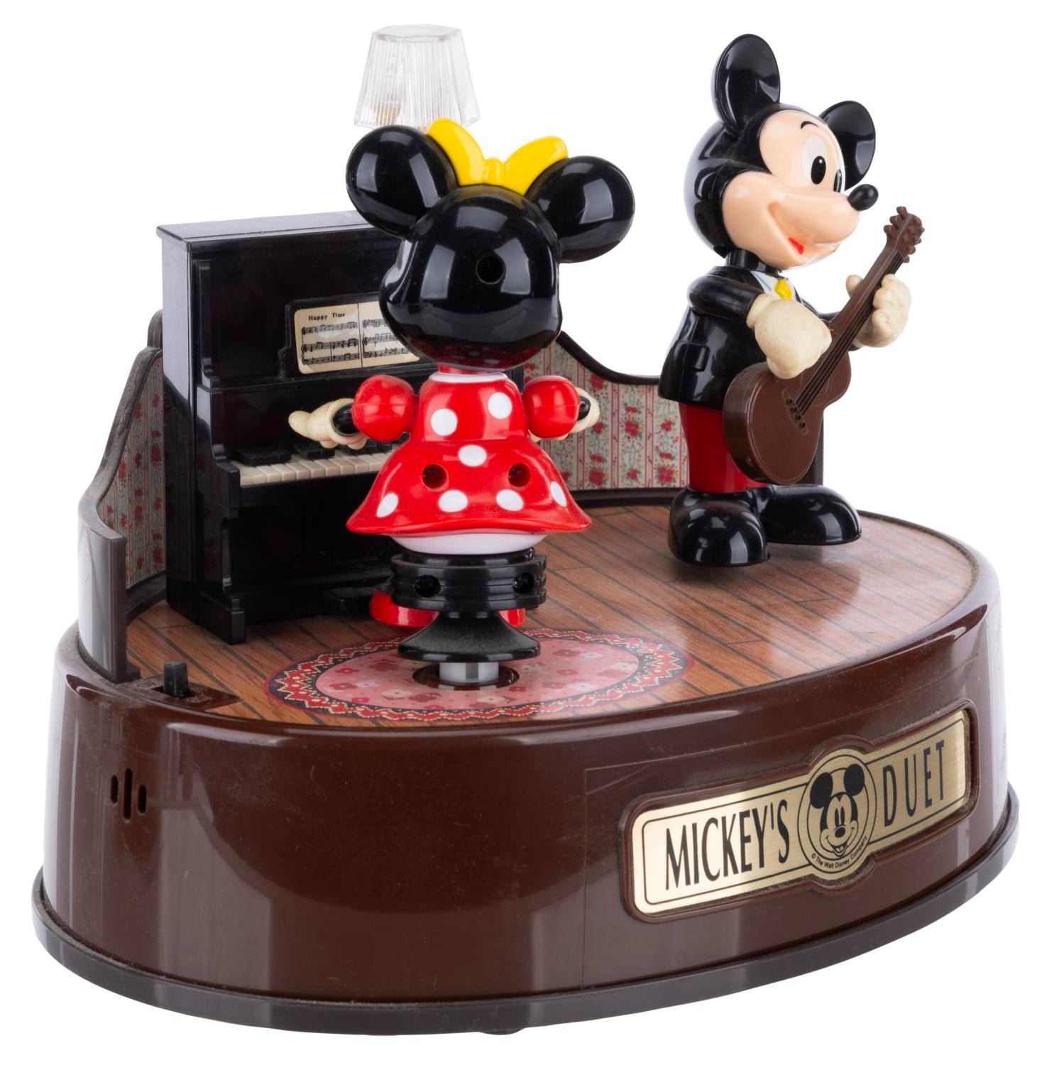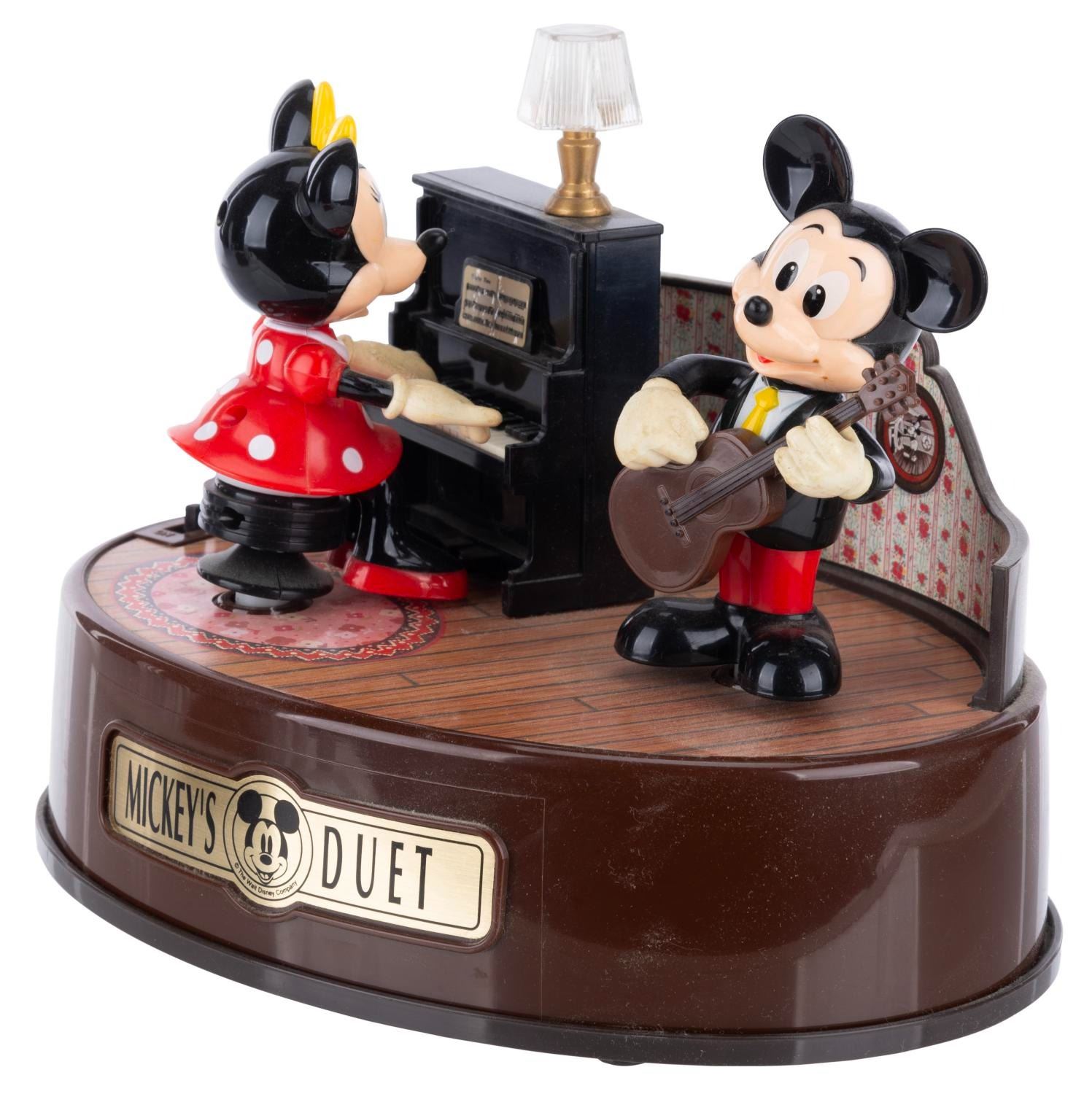 (Takara, 1980s-90s) A Mickey's Duet Sound-Activated Play-Along Show toy, featuring Minnie playing the piano and Mickey playing guitar. The piece has been tested for function and works intermittently. Measuring 5.5” x 7.75”, the piece displays in very good condition with light discoloration from age, scuffs, and the characters' hands sticky to the touch.