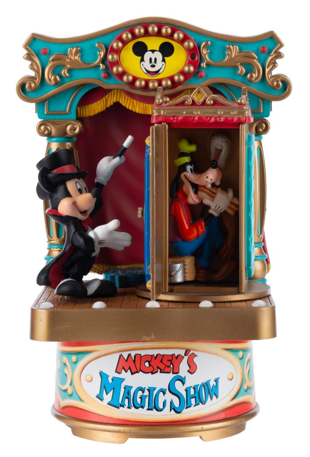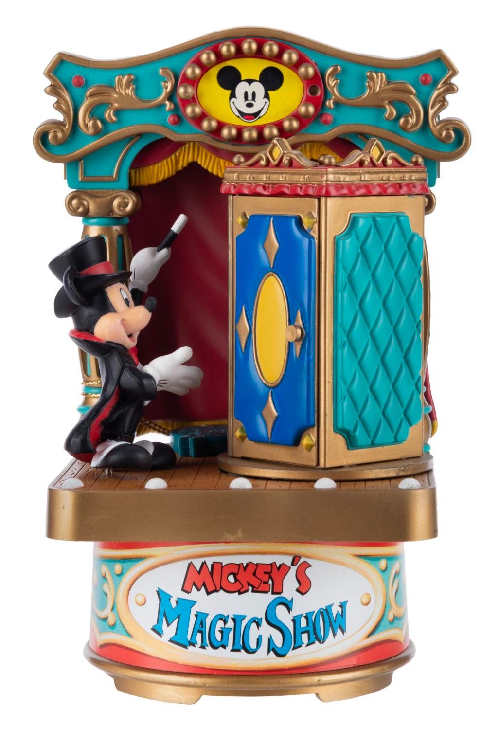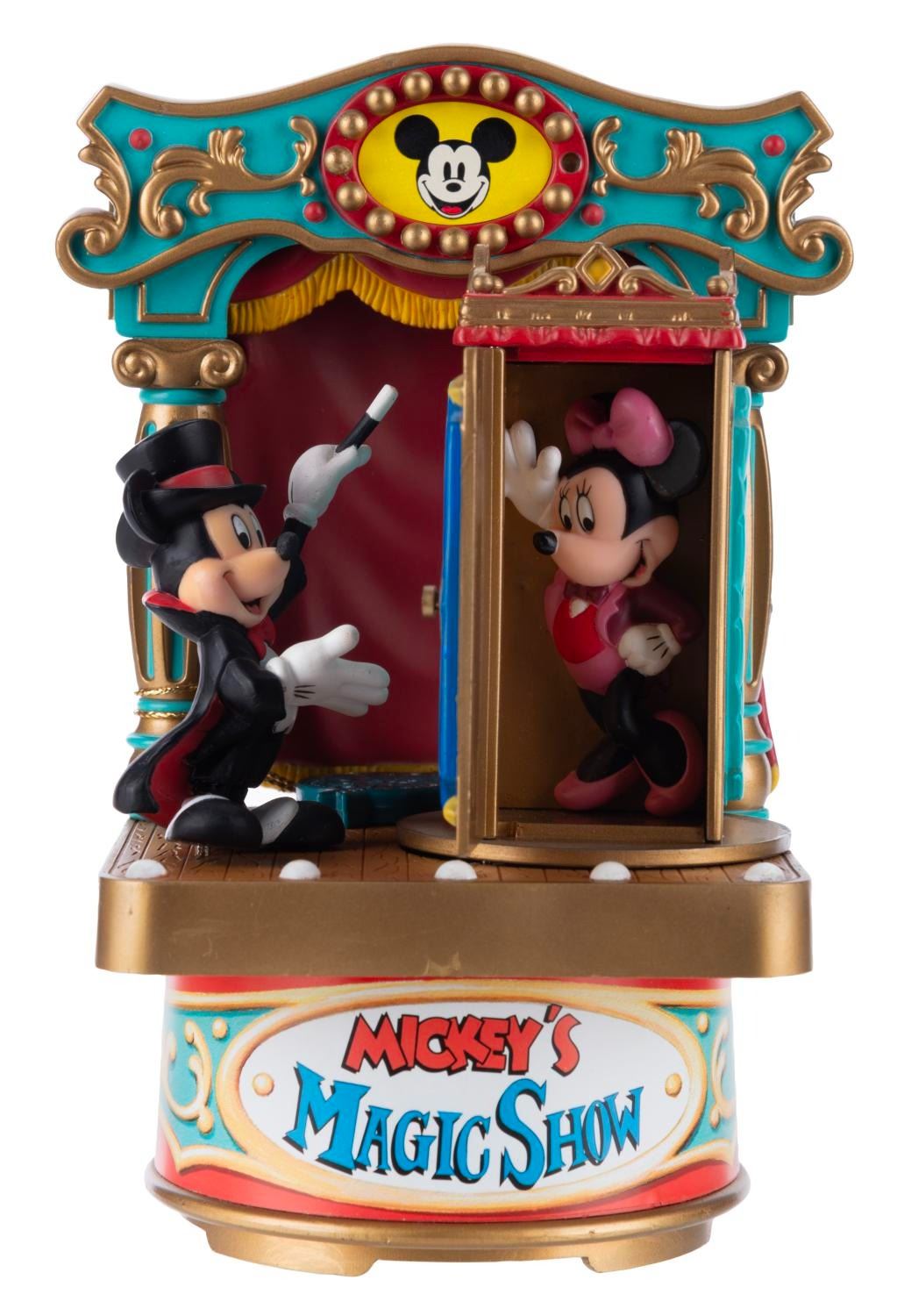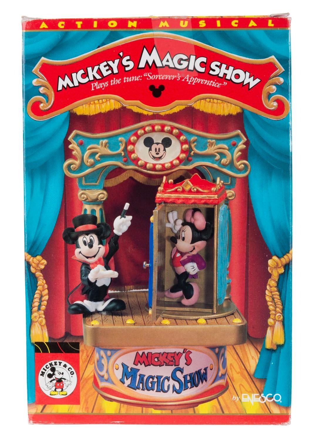 (Enesco, 1995) A "Mickey's Magic Show" Action Musical Figurine. This wind-up animated piece plays the "Sorcerer's Apprentice" music and features Mickey and a Magic Box with opening doors revealing a magically appearing Minnie and Goofy. Measuring 6.5"x3.5"x4", this collectible piece has been tested for function and is in fine working condition, and comes within its original 5.25"x5.25"x8" box.