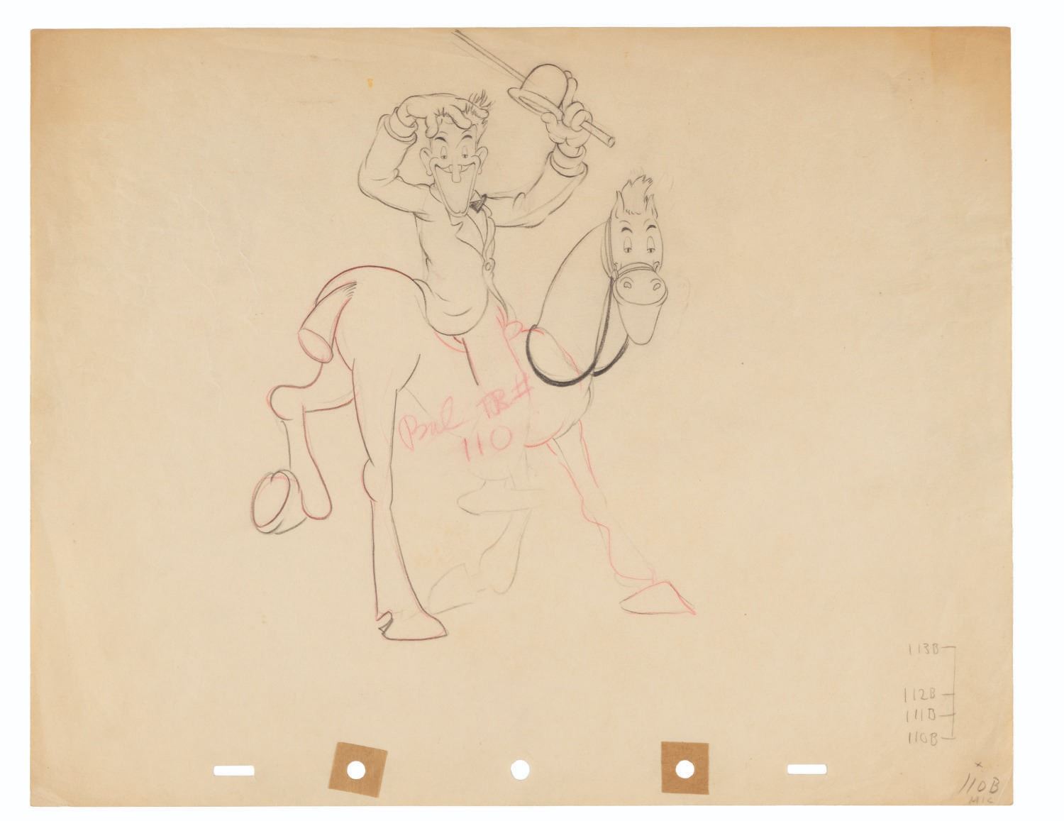(Disney, 1936) An original production drawing of Stan Laurel from “Mickey’s Polo Team.” The short, inspired by Walt’s own love of the sport, featured Mickey, Donald, Goofy, and the Big Bad Wolf facing off against Hollywood stars Stan Laurel, Oliver Hardy, Harpo Max, and Charlie Chaplin. Accomplished in graphite and colored pencil with a character image size of 5.5” x 7.5” on 9.5” x 12” animation paper, the drawing displays in very good condition with creases, a small stain, and discoloration from age.