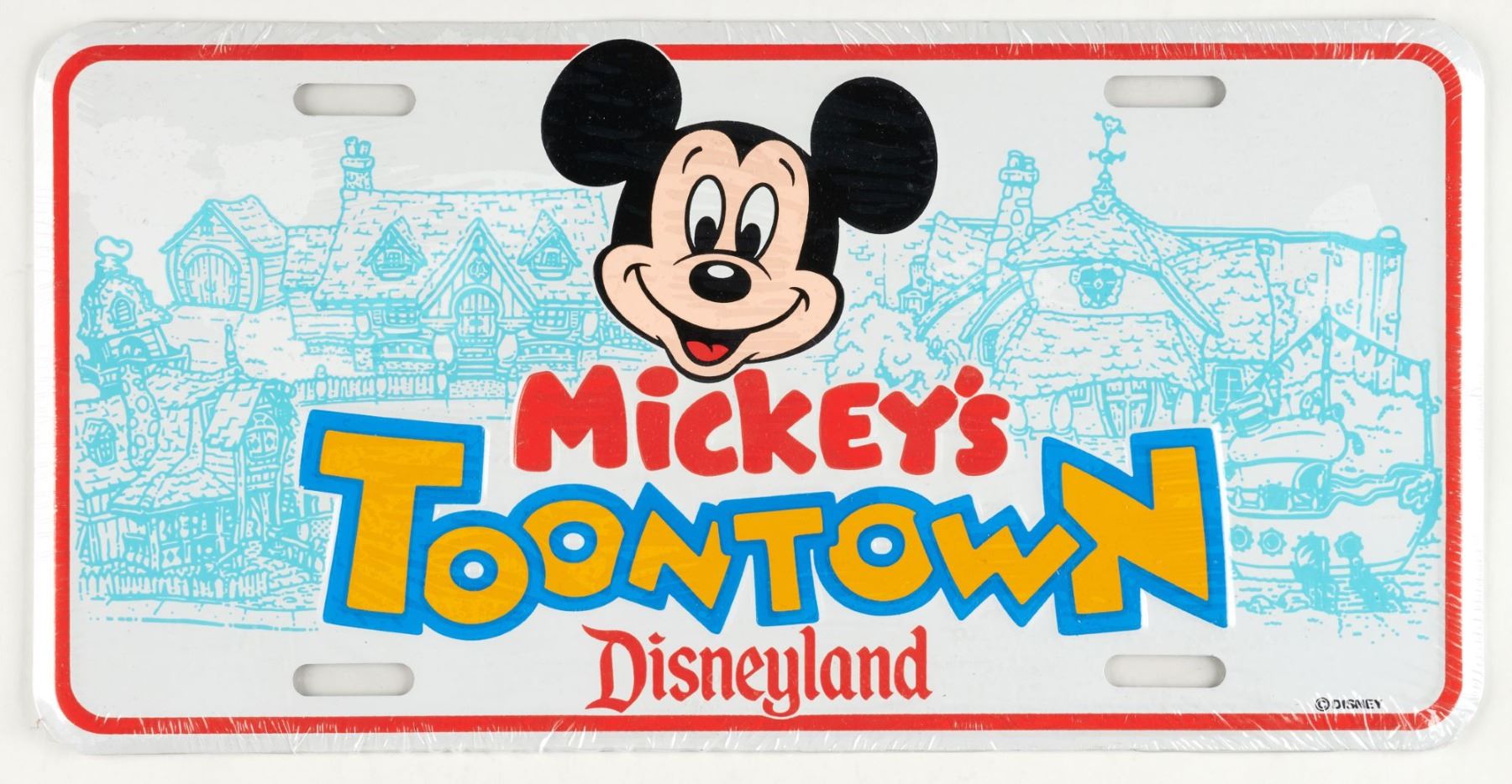 (Disneyland, 1990s) A souvenir novelty license plate from Mickey’s Toontown at Disneyland. Measuring 6" x 11.75", the license plate is in fine condition sealed in the original shrink wrap, with very minimal wear to the wrap.