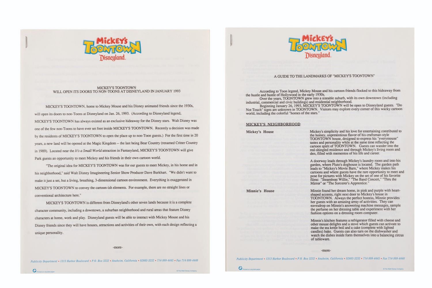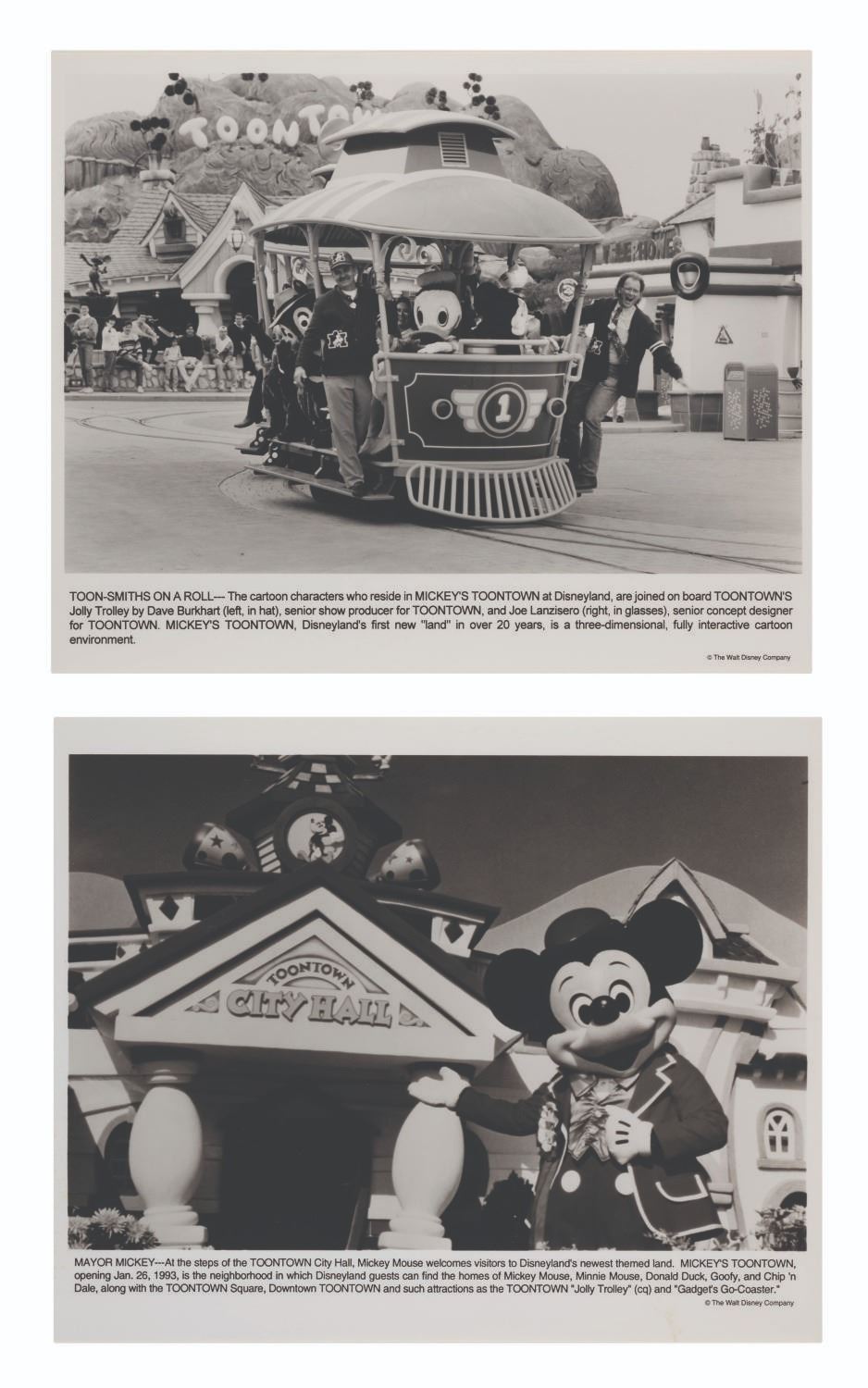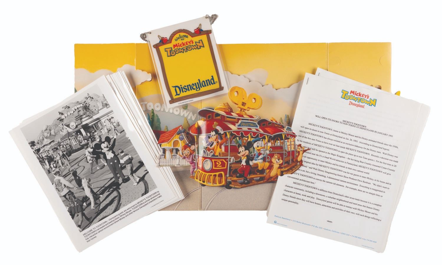 (Disneyland, 1993) A press kit created for the grand opening of Disneyland's newest land - Mickey's Toontown. The kit includes photo prints, releases, and a lanyard, within a stylish pop-up folder. Measuring 9"x12", the folder is in good condition exhibiting a few small bends to its pop-up elements, and light wear.