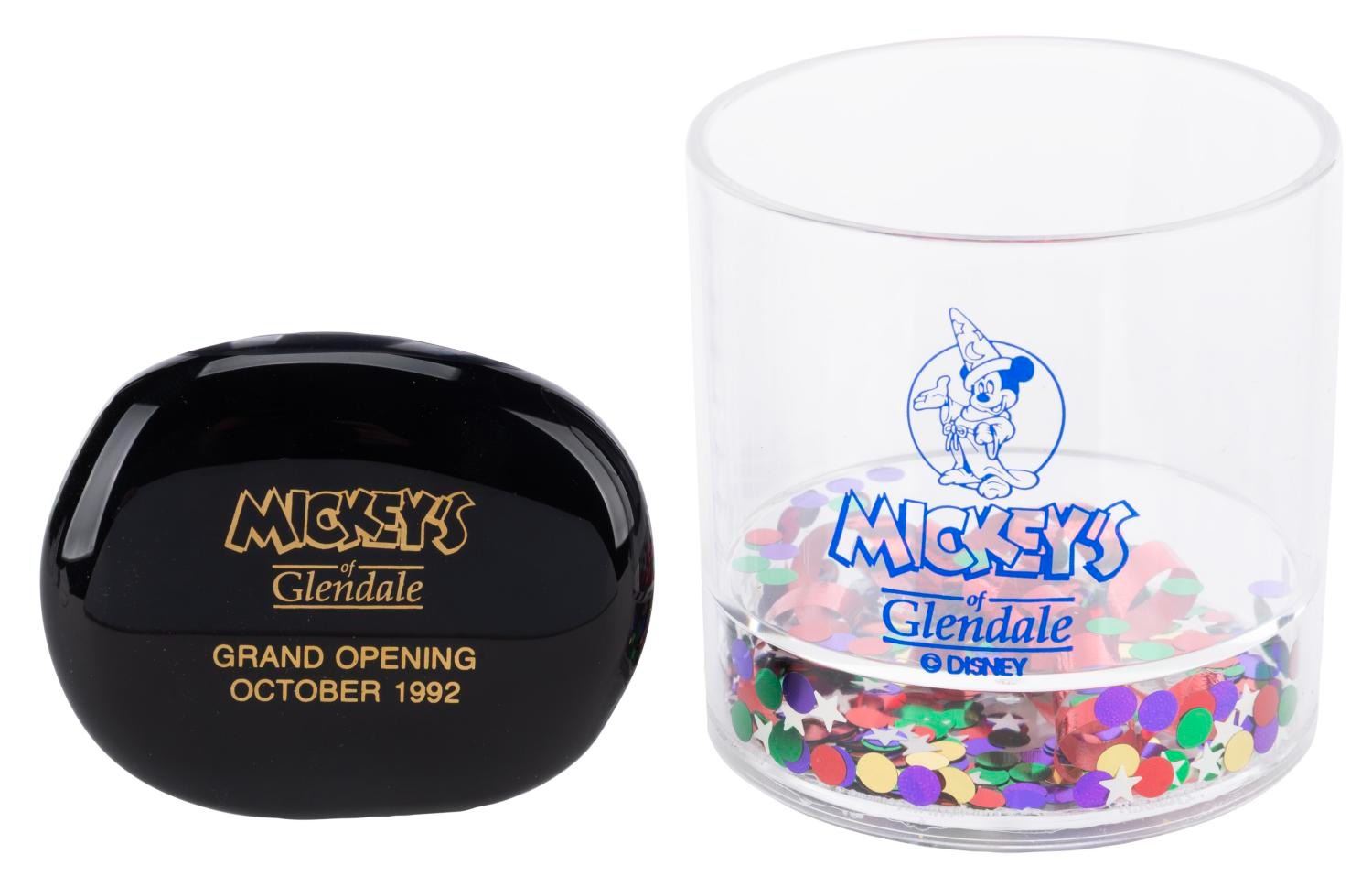 (Mickey's of Glendale, 1992) Three souvenirs from the Grand Opening of Mickey's of Glendale, including a plastic tumbler with a confetti-filled base, a black glass stone that reads "Mickey's of Glendale Grand Opening," and an "I've Got Environmentality" flyer. Measuring 2.75" x 3.35" to 3.5" x 3.5" x 3.5" tall, the tumbler and rock are in fine condition, while the flyer is in fair condition with heavy creasing and soiling.