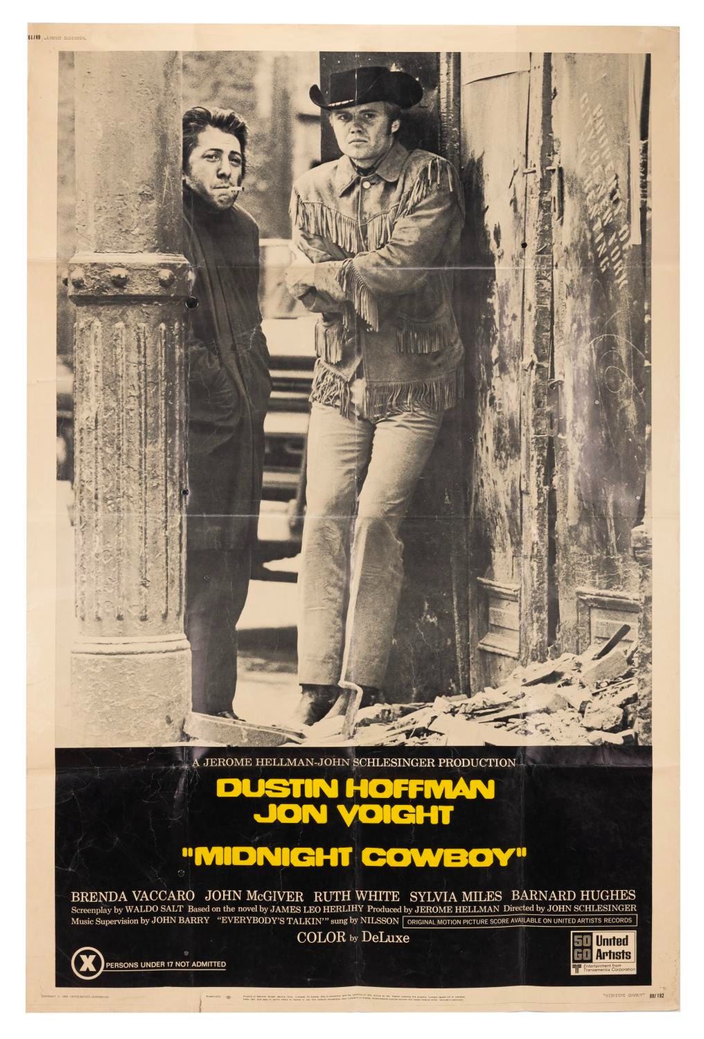 (United Artists, 1969) A two-sheet for "Midnight Cowboy," starring Dustin Hoffman and Jon Voight. The film is the only X-rated movie to win Best Picture at the Oscars. Measuring 39.5" x 60", the poster is in fair condition with heavy creases throughout, edge tears up to 3" long, pinholes, wear along the original folds, and discoloration from age.