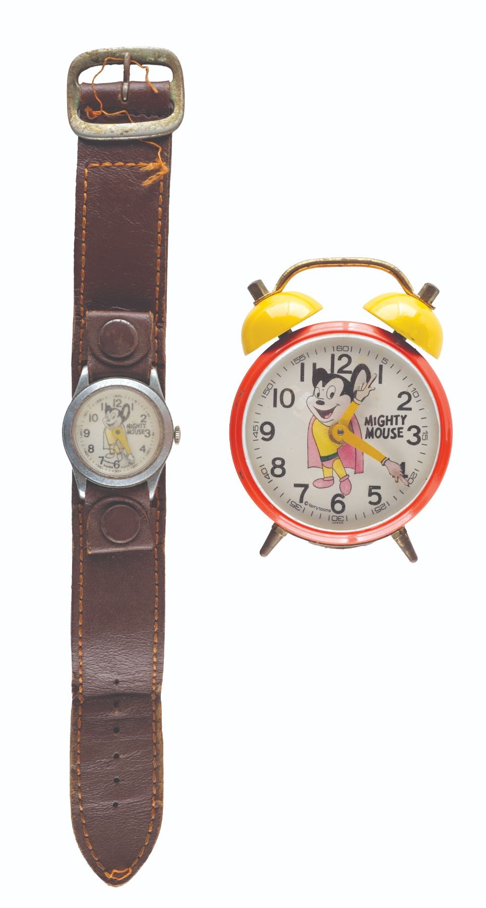(Terrytoons, 1960s-80s) A pair of Mighty Mouse timepieces. The wristwatch dates to the 1960s and was Swiss-made. The alarm clock was made in the 1980s in Japan. The watch measuring 1.25" x 8.75 is in fair condition with wear from use, and non-functional. The clock stands 3.25" high and displays in very good condition, with wear to brass tone parts, and is non-functional.