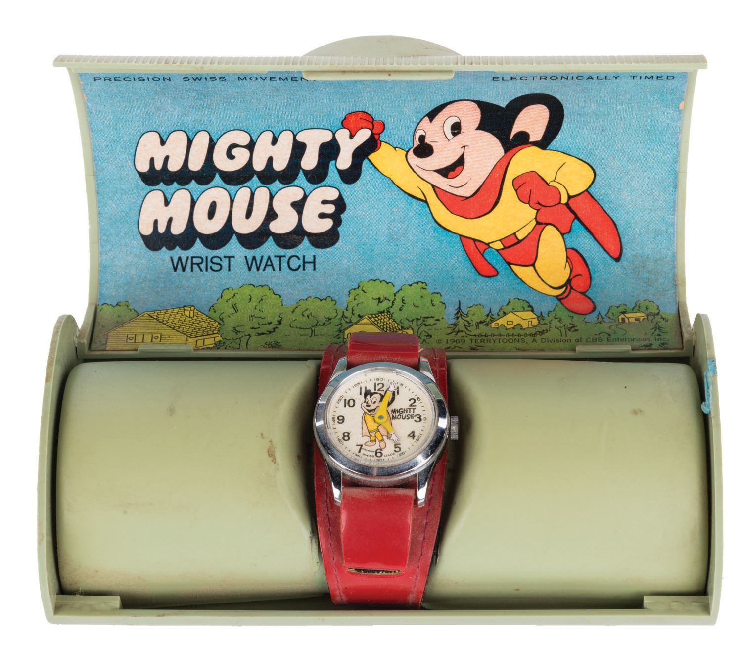 (Bradley, 1969) An original Mighty Mouse Fashion Wristwatch by Bradley. The wristwatch features Mighty Mouse, with electronically timed and precision Swiss-made movement, and bright red vinyl and leatherette band. With a 1.25" metal case, it comes inside the original 5.75" long Bradley hinged box with Mighty Mouse Fashion Wristwatch label and full-color Guarantee card. The watch is in very good condition with slight color fading to the face and mild creases to band from display. The watch has been tested for function and requires servicing.