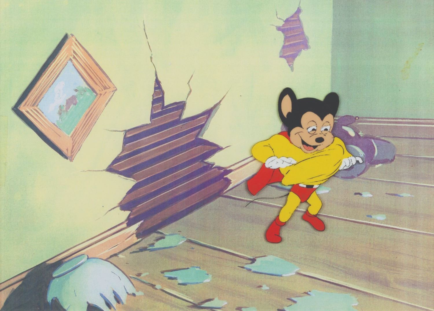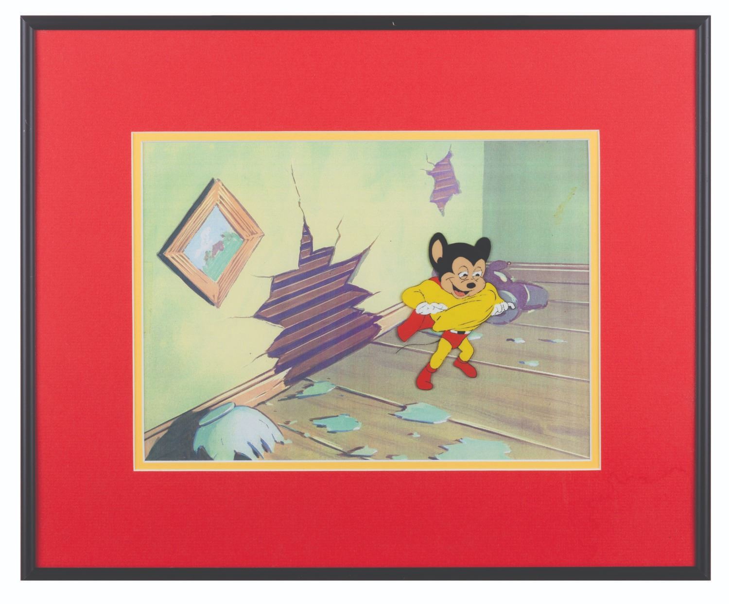 (Filmation, 1979-80) An original Mighty Mouse production cel from “The New Adventures of Mighty Mouse and Heckle & Jeckle” with a color copy background. With a character image size of 4” x 3.25” on an 8” x 11” visible cel in a 14.25” x 17.25” matted frame, the cel displays in good condition with heavy line loss throughout.