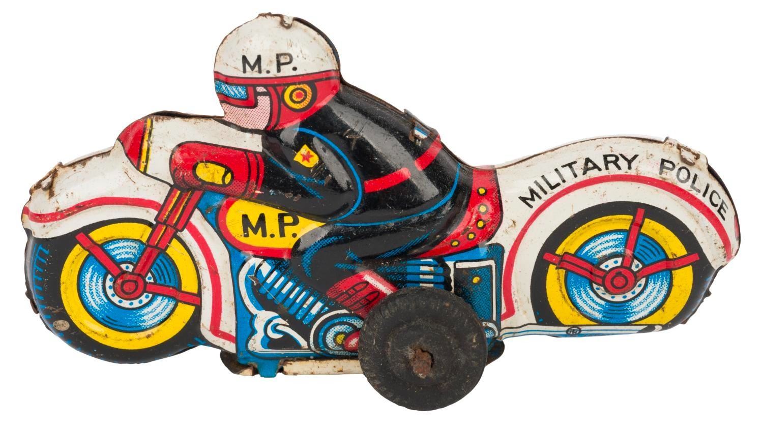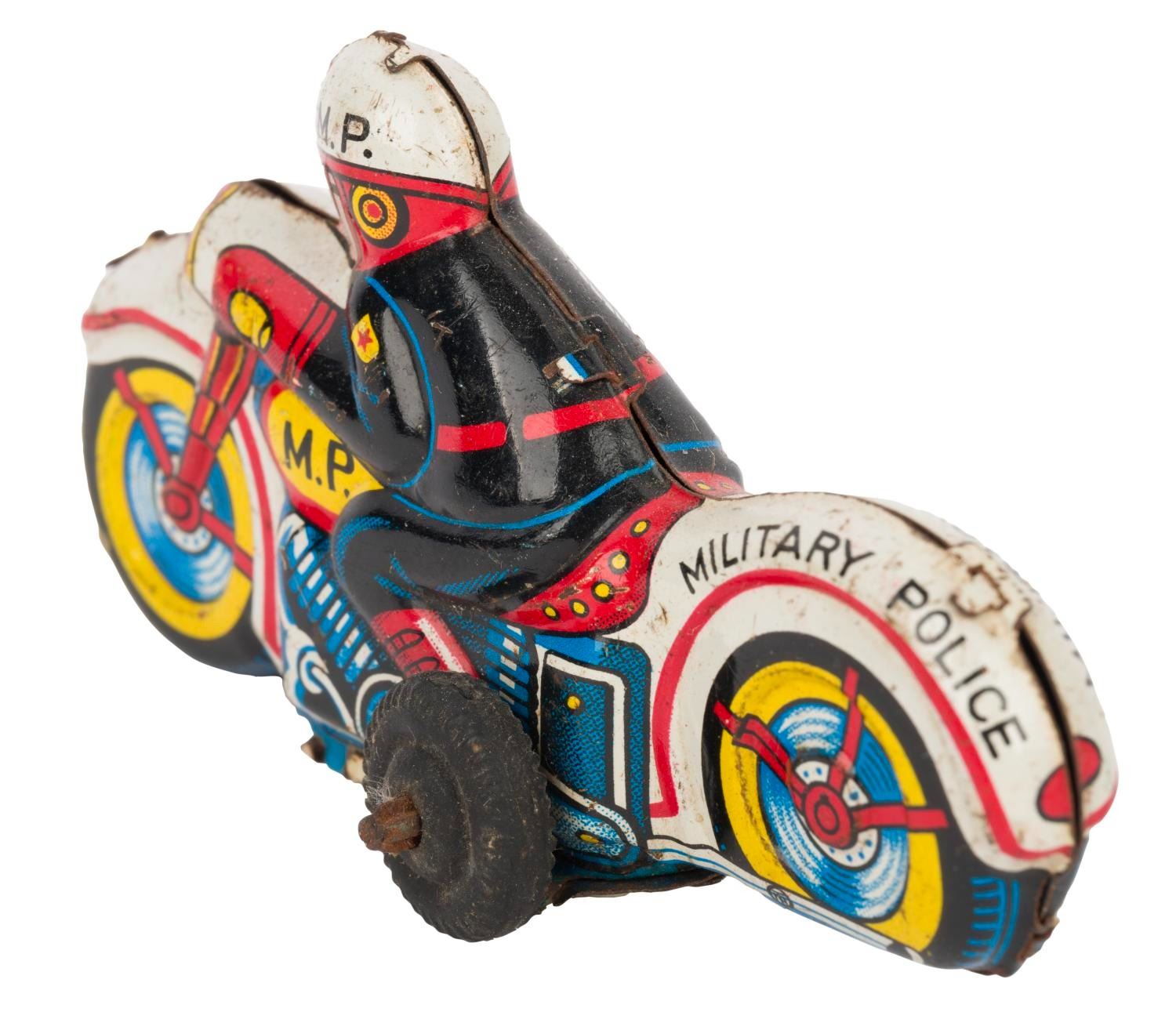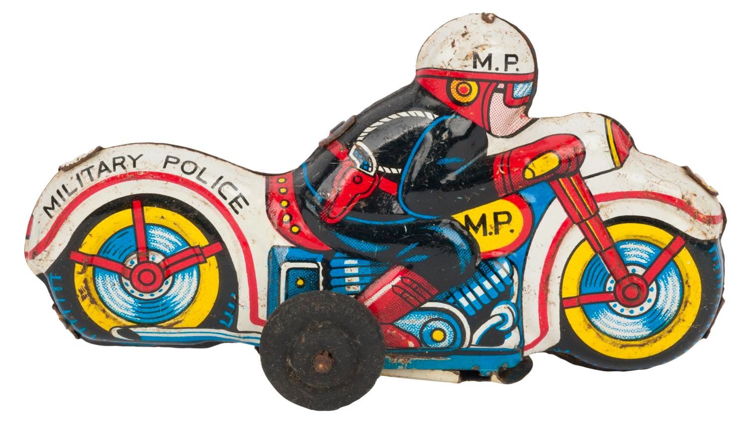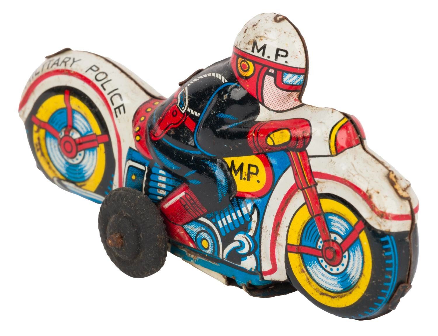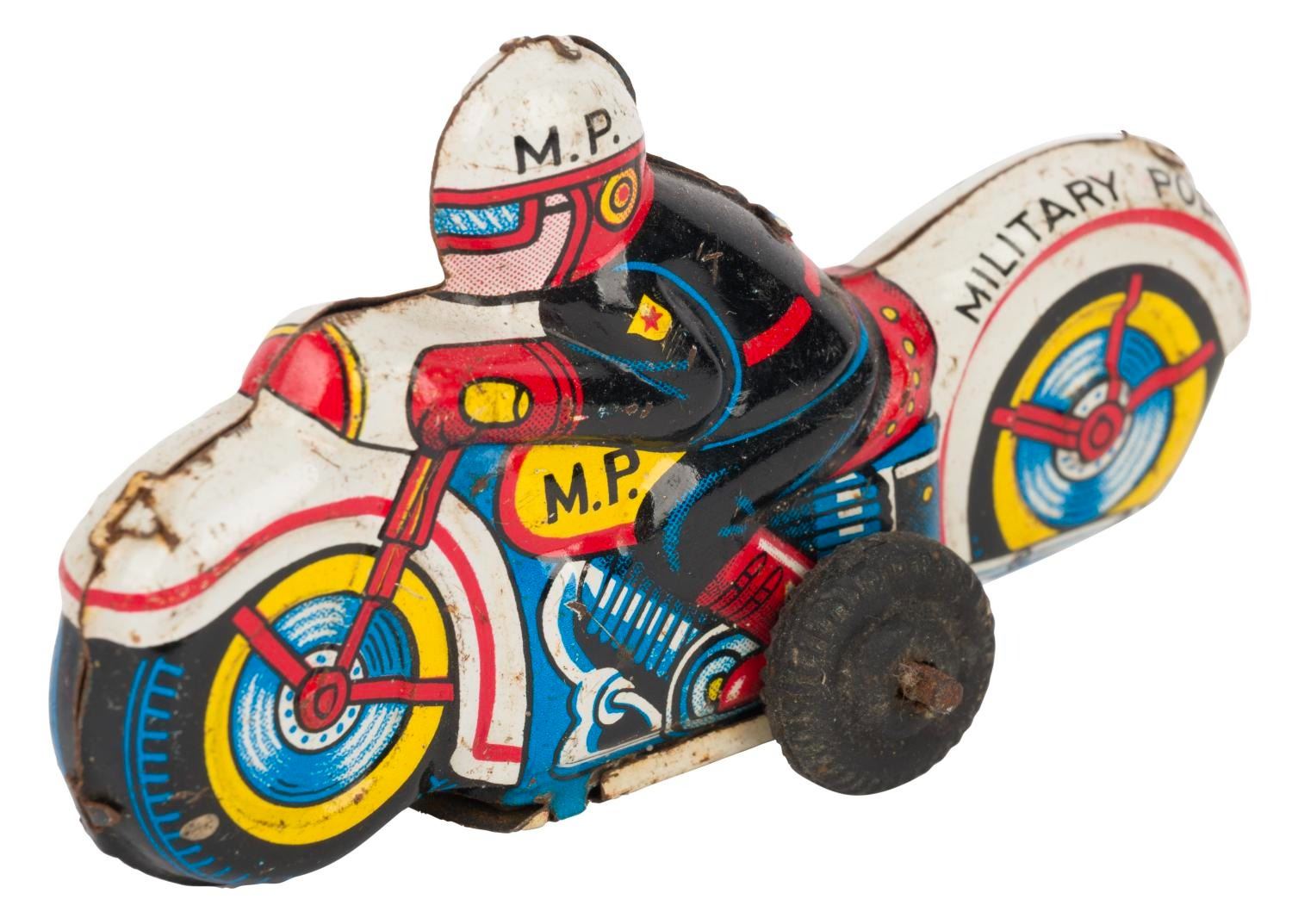 (Modern Toys, 1960s) A tin-plated Military Police Motorcycle friction toy manufactured in Japan by Modern Toys. Measuring 3.5" long, the toy is in good condition with light oxidation, scuffs, wear to the tin lithographic parts, and a non-working friction feature.