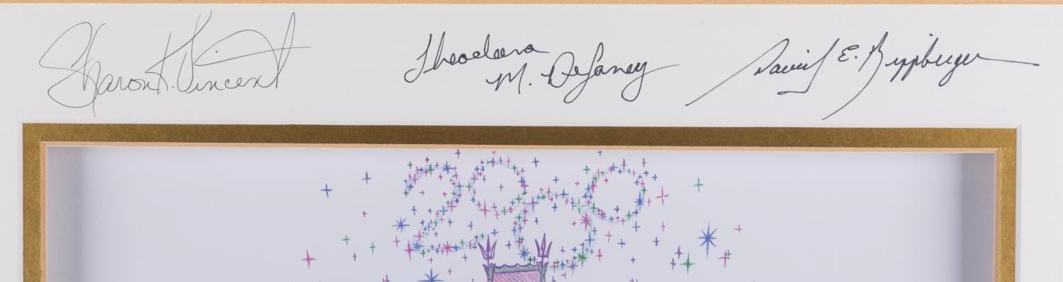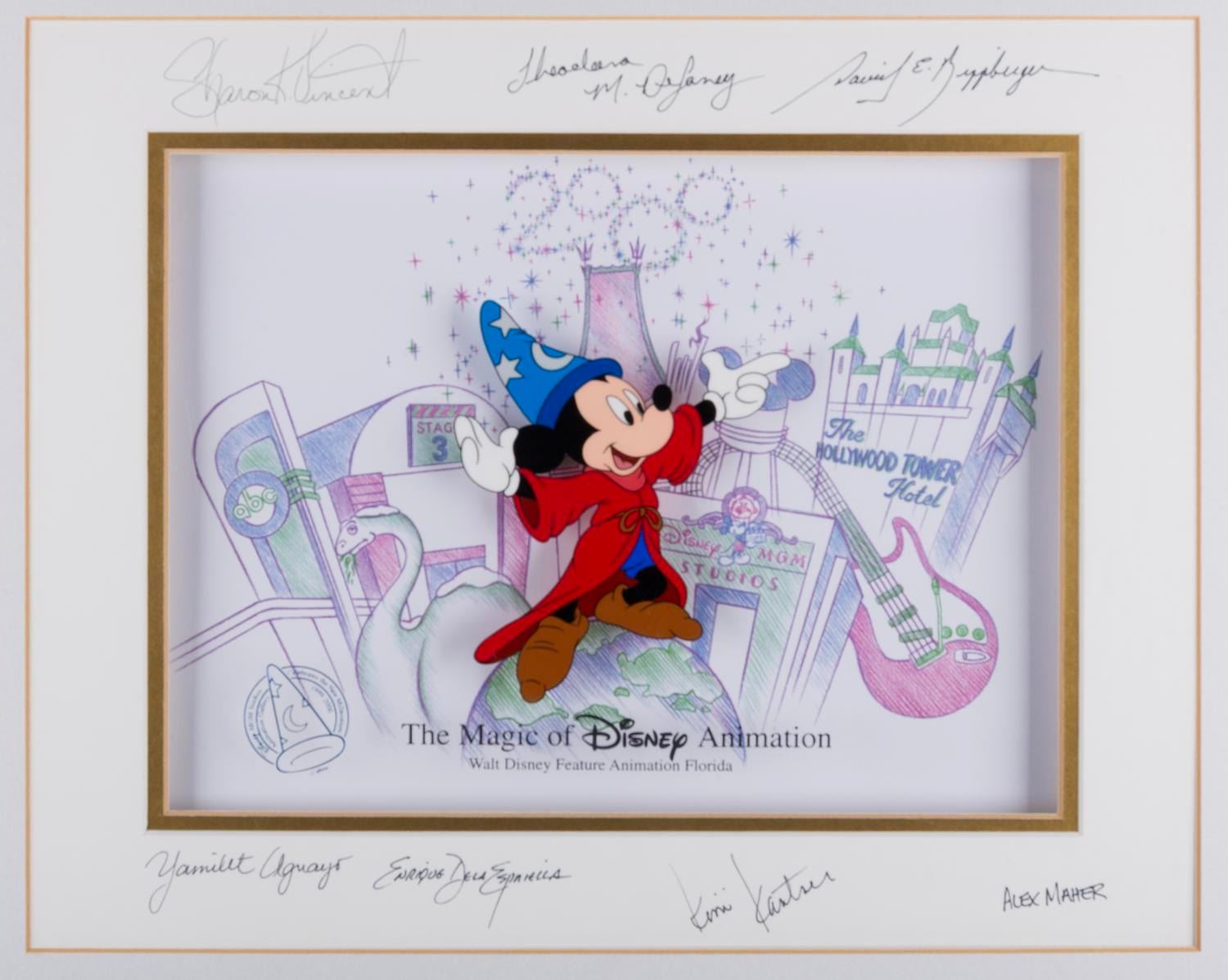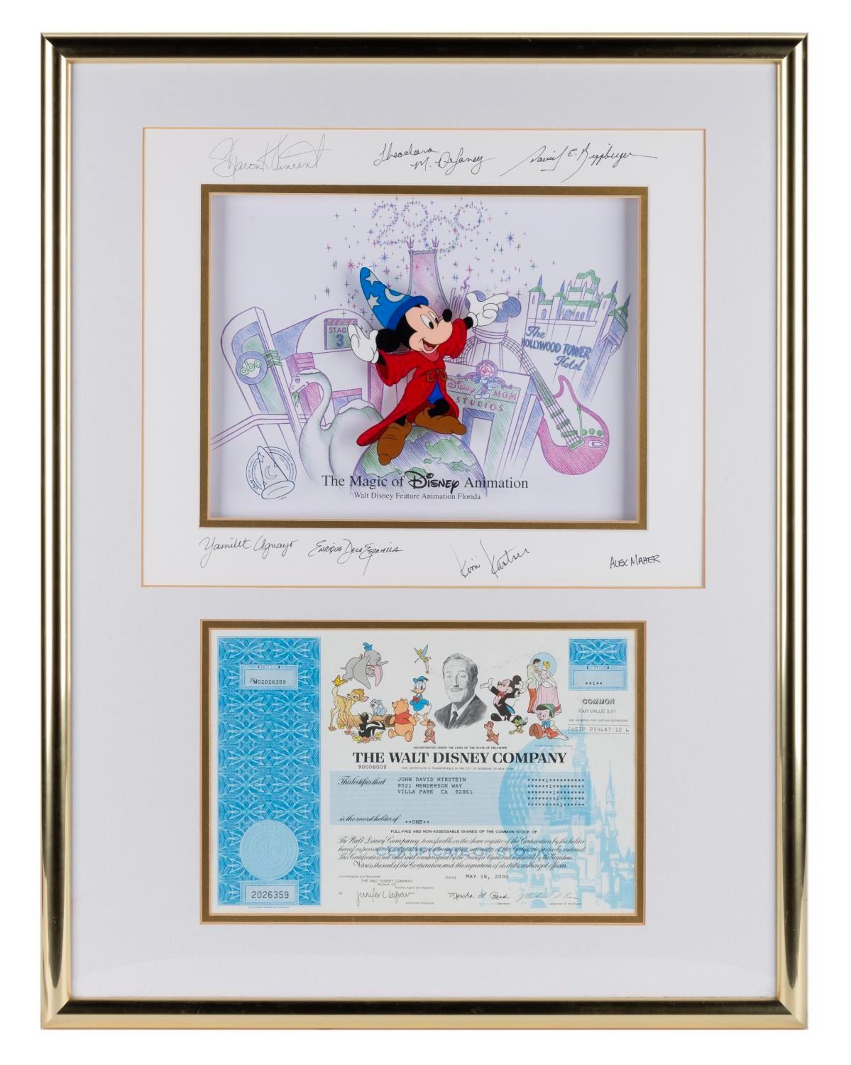 (Disney-MGM Studios, 2000) A "Millennium Magic" cel and a Walt Disney Company stock certificate. The cel's mat border has been signed by seven Walt Disney Feature Animation artists including Alex Maher, Sharon Vincent, Theodora M. Delaney, Yamilet Aguayo, Enrique De La Espriella, and two others. The voided Certificate for one share is dated "May 16, 2000." The cel measures 10"x13" in a 21.5" x 27.5" frame and the certificate is 12.5"x8.5". Each piece is in fine-to-very good condition with minor wear.