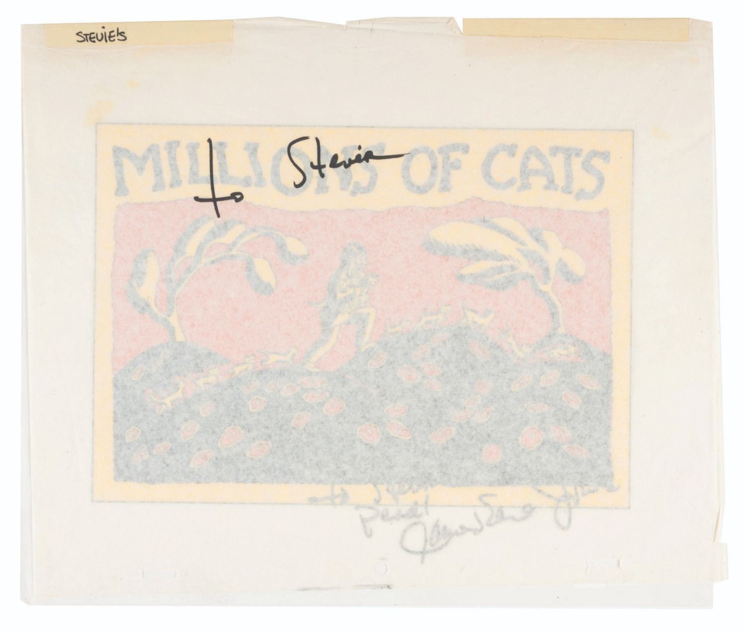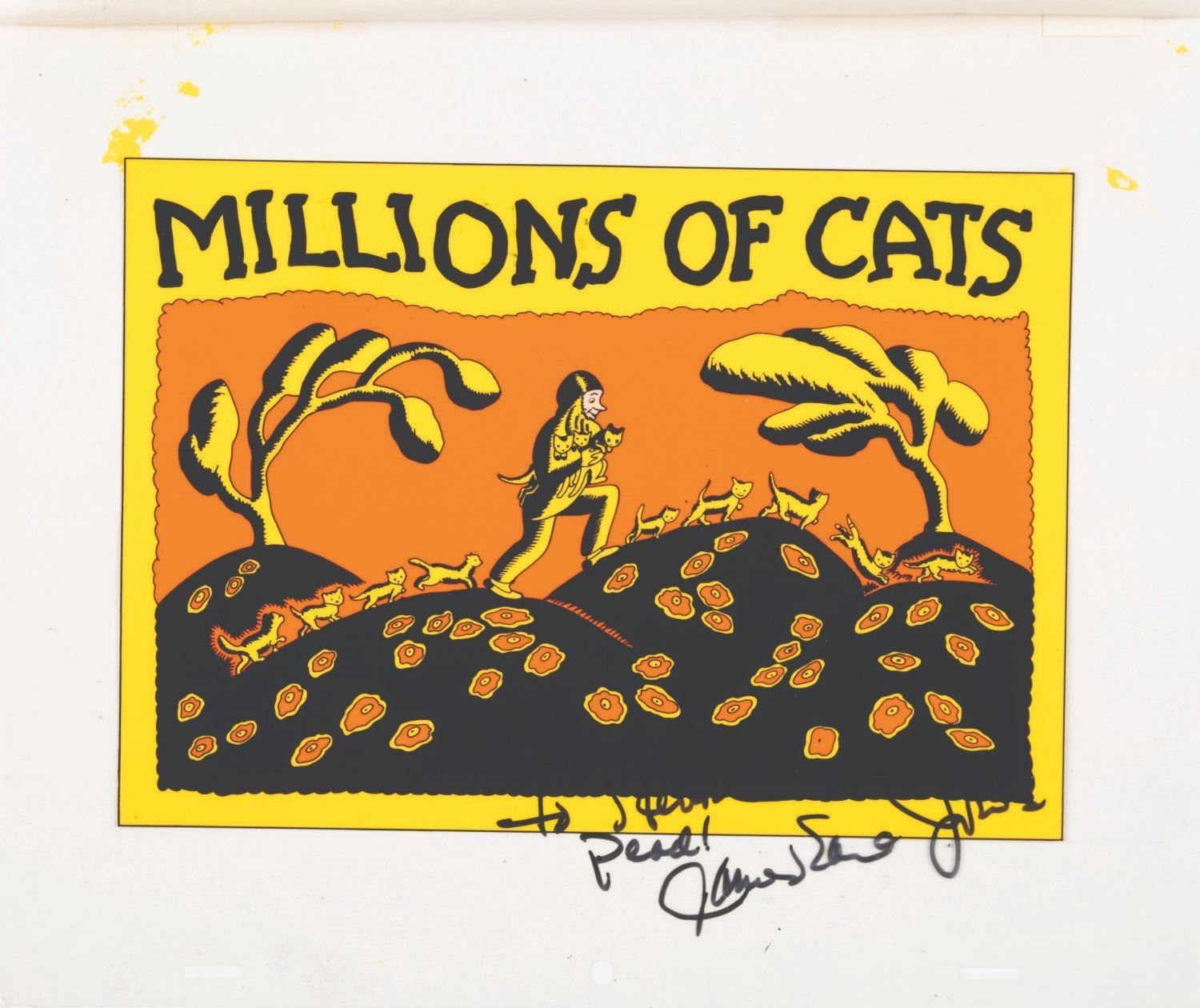 (Universal/Think Entertainment, 1992) An original hand-painted promotional cel for the “Millions of Cats” segment of “Shelley Duvall’s Bedtime Stories” signed with a dedication by James Earl Jones, who provided the narration. The character designs are based on the original illustrations by the published story’s author and artist Wanda Gág. The cel measures 10.5” x 12.5” with an image size of 7” x 9.75” and is in very good condition with light spots of stray cel paint from production use and tape along the top edge which does not affect the image. "Shelley Duvall's Bedtime Stories" was an anthology series hosted by Duvall featuring animated adaptations of renowned and beloved children’s books. Each story was narrated by a different guest celebrity and animated in the style of the original book’s illustrations.