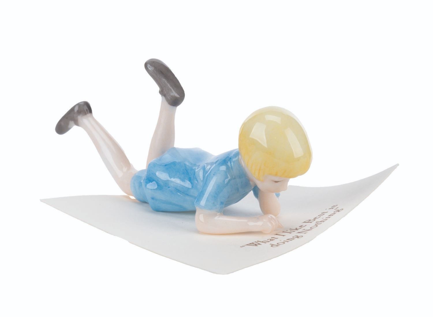 (Michel and Co., 1990s) A mini ceramic figurine of Christopher Robin, inspired by the original illustrations for the Winnie the Pooh books by E. H. Shepard. The figure is attached to a card with a quote that reads, "What I like Best is doing Nothing." Measuring 2.5" x 0.75" x 1" tall, the figurine is in fine condition.