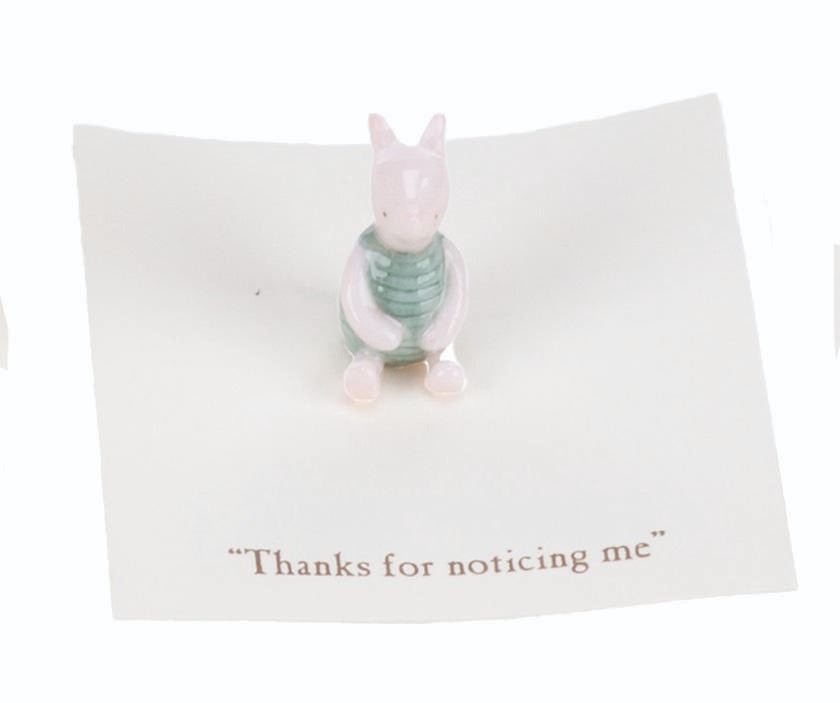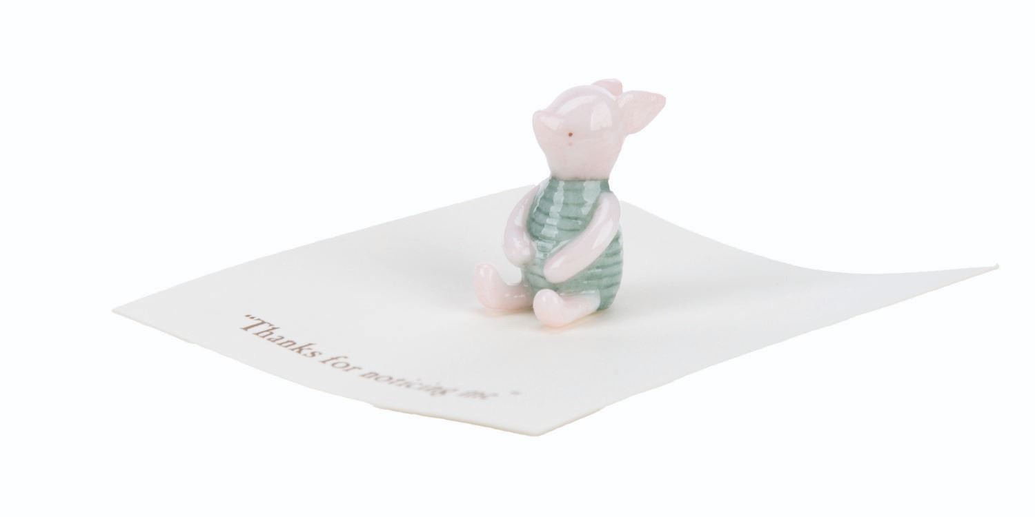 (Michel and Co., 1990s) A mini ceramic figurine of Piglet, inspired by the original illustrations for the Winnie the Pooh books by E. H. Shepard. The figurine is attached to a card with a quote that reads, "Thanks for noticing me. " Measuring 0.75 " tall, the mini figurine is in fine condition.
