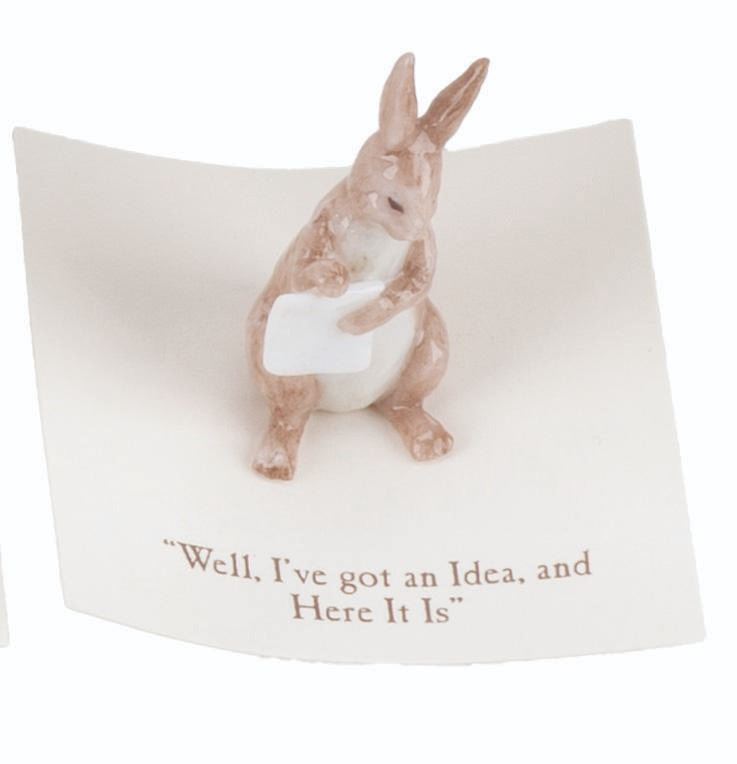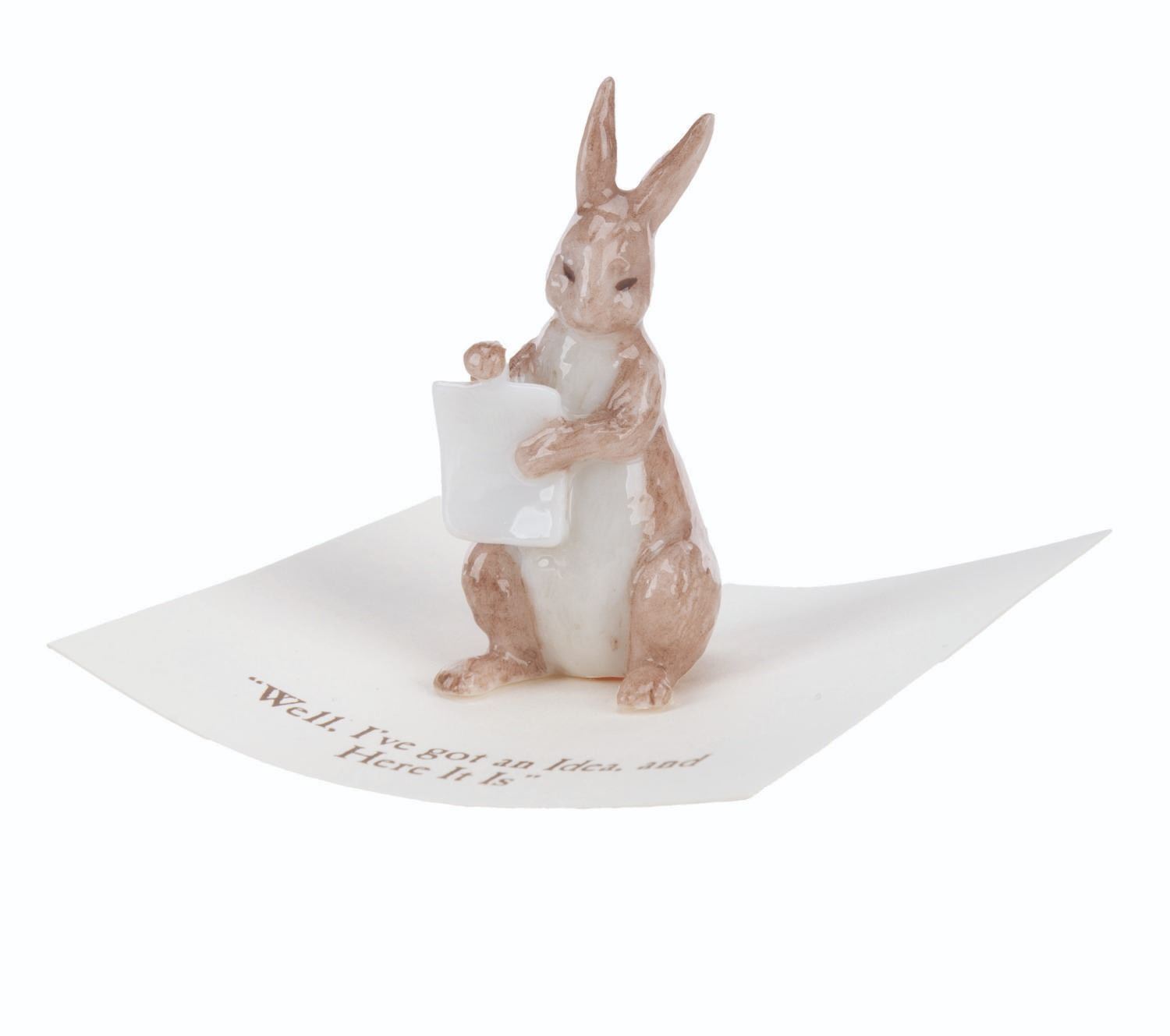 (Michel and Co., 1990s) A mini ceramic figurine of Rabbit, inspired by the original illustrations for the Winnie the Pooh books by E. H. Shepard. The figurine is attached to a card with a quote that reads, "Well, I’ve got an Idea, and Here it is." Measuring 1.5" tall, the figurine is in fine condition.