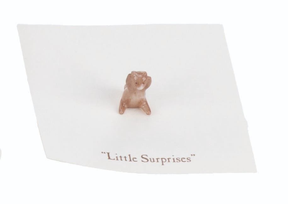 (Michel and Co., 1990s) A mini ceramic figurine of Roo, inspired by the original illustrations for the Winnie the Pooh books by E. H. Shepard. The figure is attached to a card with a quote that reads, "Little Surprises." Measuring 0.5", the little figurine is in fine condition.