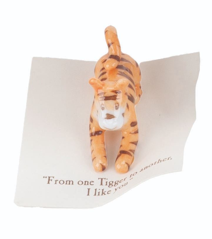 (Michel and Co., 1990s) A mini ceramic figurine of Tigger, inspired by the original illustrations for the Winnie the Pooh books by E. H. Shepard. The figurine is attached to a card with a quote that reads, "From one Tigger to another, I like you." Measuring 1.5" x 0.75" x 1" tall, the figurine is in fine condition.