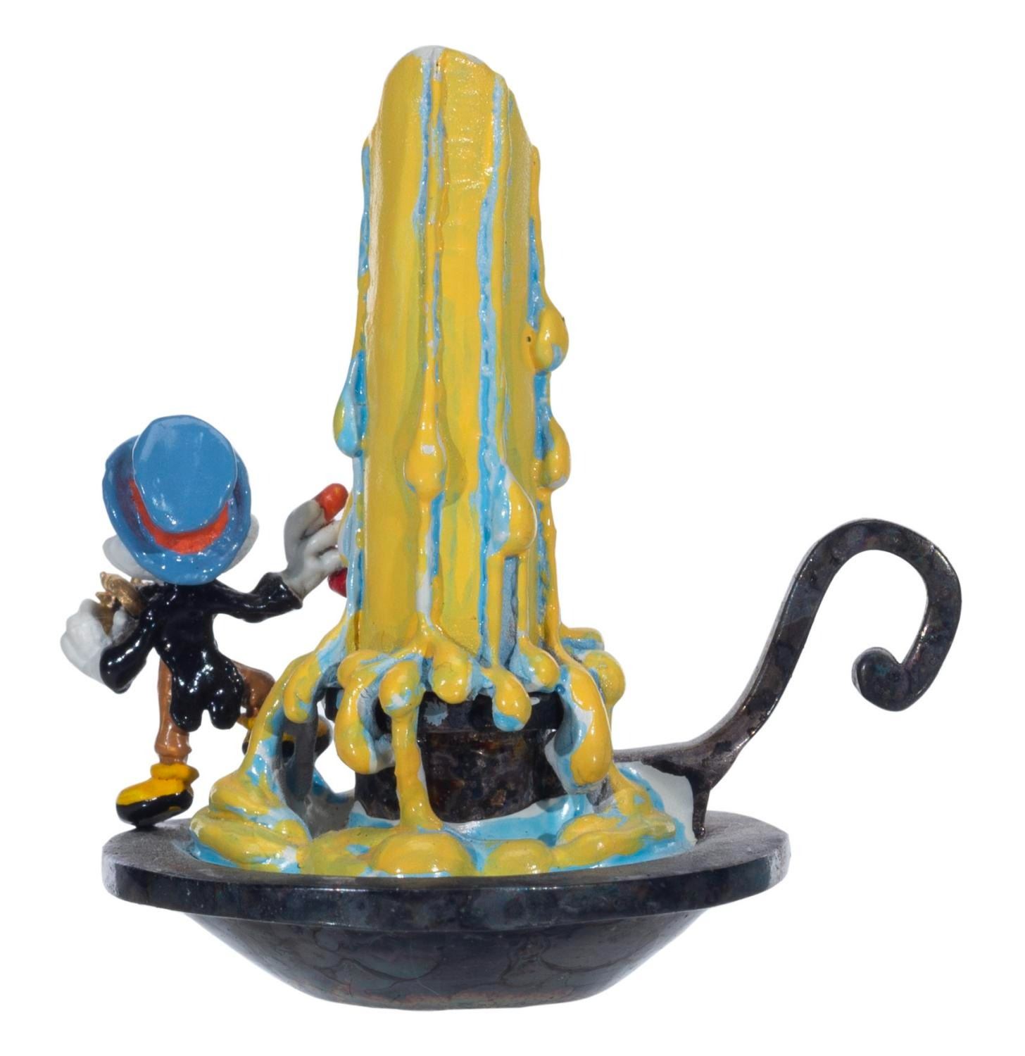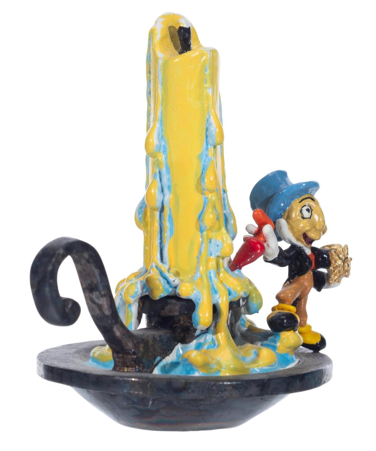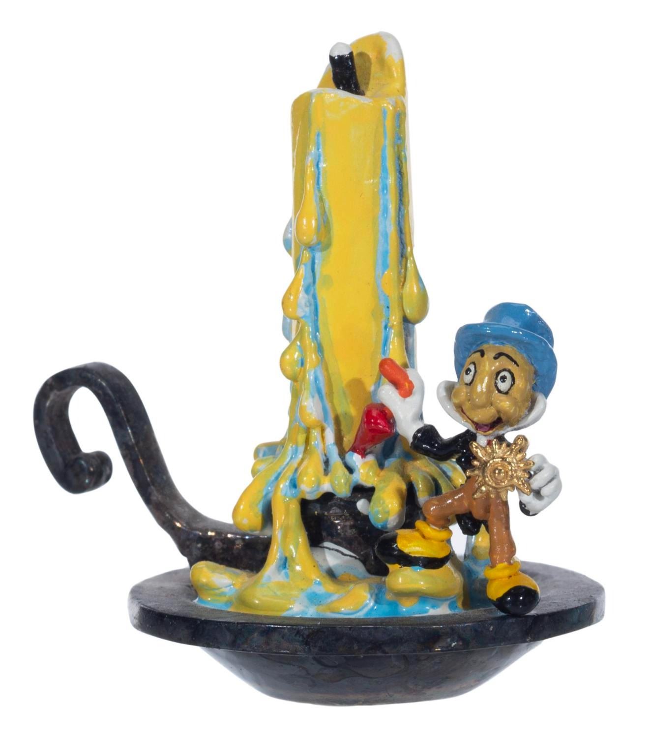 (C. Julian, 1988) A miniature bronze figure of Jiminy Cricket on the candle stand from "Pinocchio," by artist C. Julian. Measuring 1" x 1.25" x 1.25" tall, the figure is in very good condition.