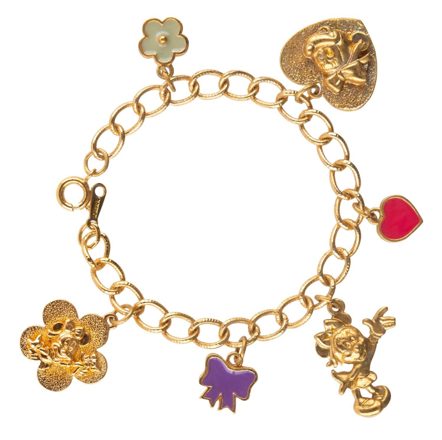 (Disney, 1980s-90s) A Minnie Mouse charm bracelet with six charms of Minnie, flowers, and hearts. Two of the charms feature text on the reverse, reading "Best friends" and "Friends Forever." Measuring 6" in length, with 0.25" to 1" charms, the bracelet is in fine condition.