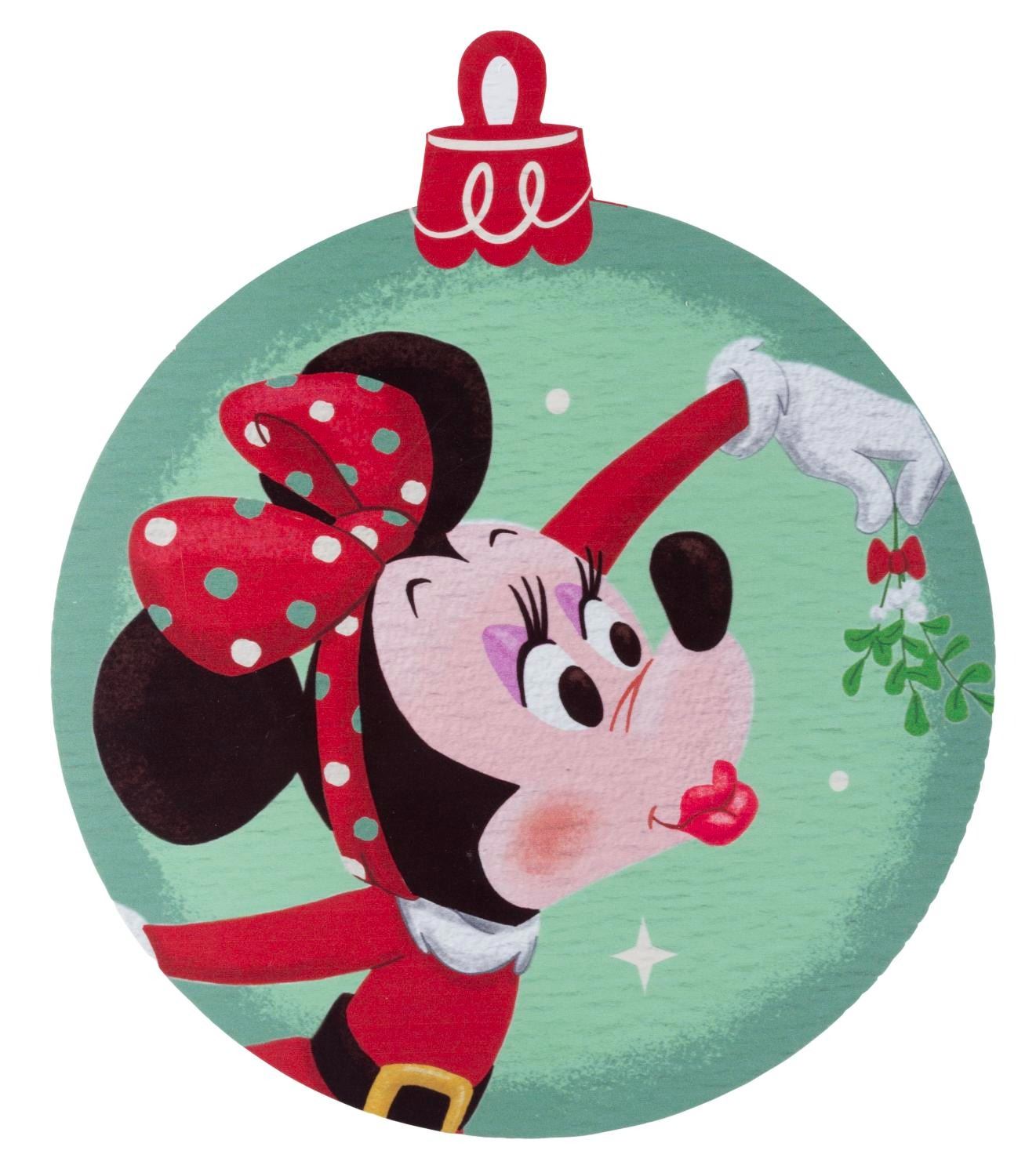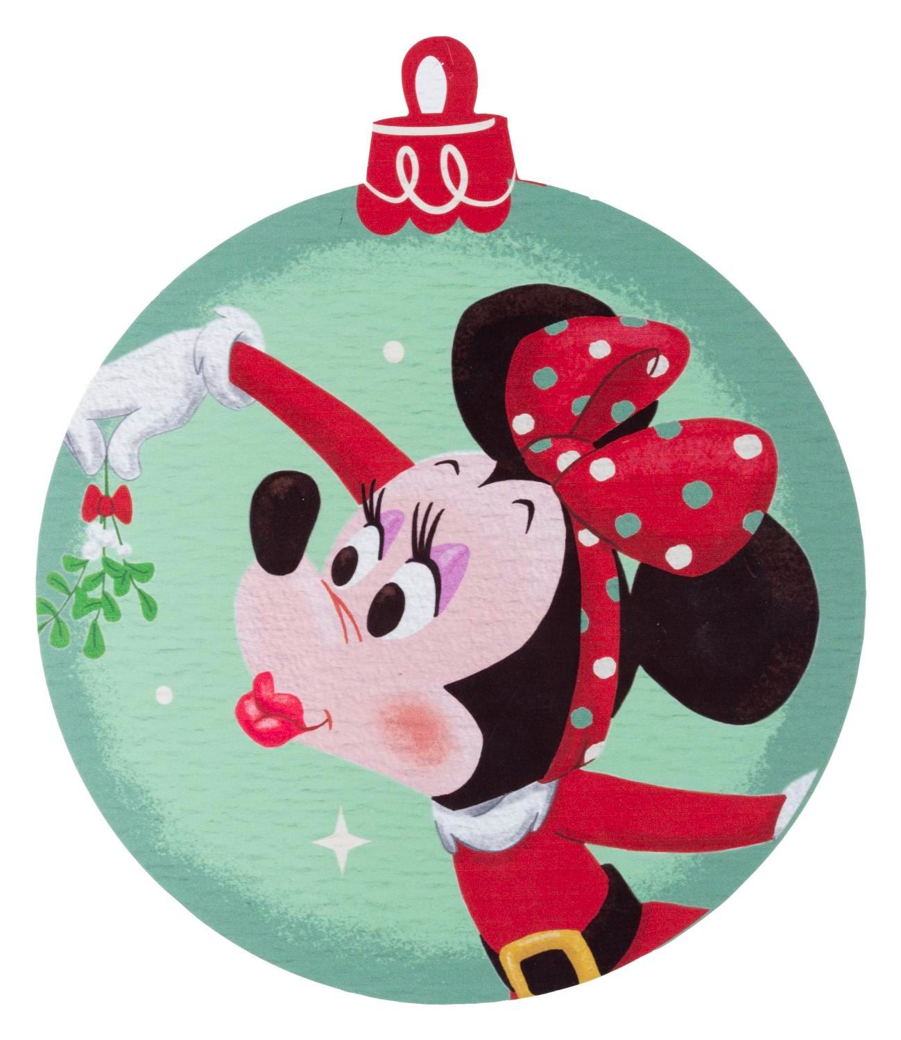 (Disneyland, 2000s) A Park-used double-sided Christmas ornament shaped hanging sign featuring Minnie Mouse. Measuring 16” x 13.75” the sign is in very good condition with light edge wear along the top.