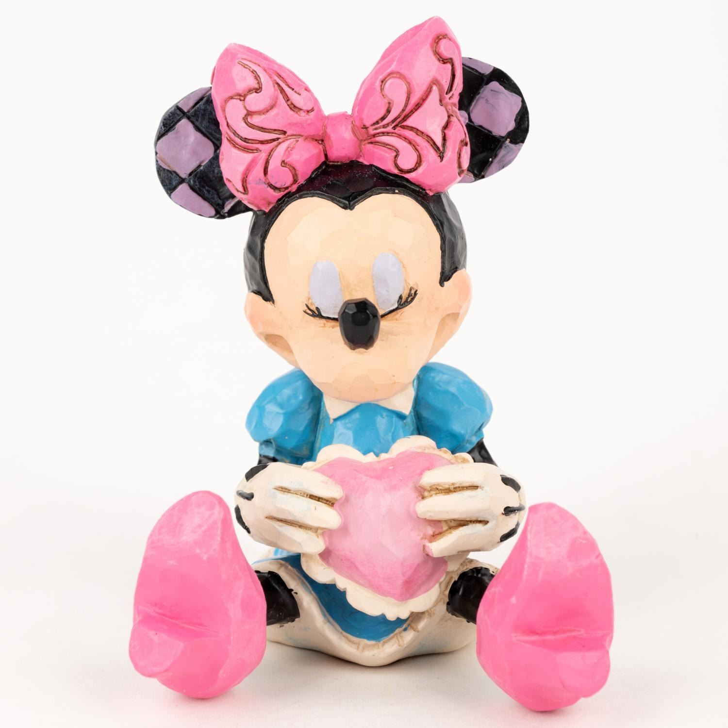 (Enesco, 2016) A Disney Traditions miniature figurine of Minnie Mouse designed by Jim Shore and released for Valentine's Day. Measuring 2.25" x 2" and 2.75" tall, the stone resin figurine is in fine condition and comes with the original 3.75" x 3.25" x 4.25" box.
