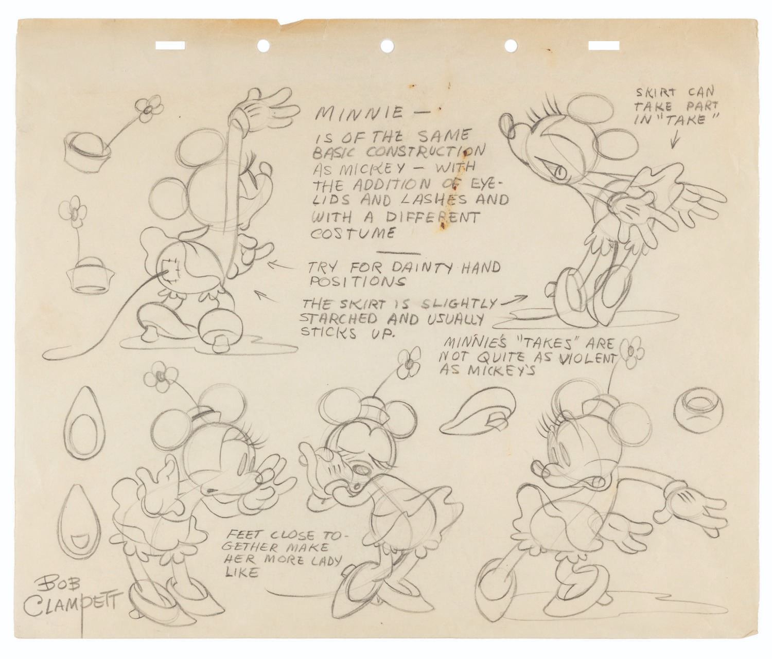 (Clampett, 1937-38) A Minnie Mouse model sheet hand drawn by Bob Clampett. This sheet very closely matches the official Disney Studio Minnie Mouse model sheet dated July 20, 1937, but signed by Bob Clampett instead of Disney artist Don Towsley. Accurately reproducing model sheets was, at the time, a standard exercise for animators applying to a Studio. Drawn on Disney animation paper, this sheet suggests Clampett may have been exploring the possibility of moving to Disney when he was seeking an opportunity to start directing. Measuring 10” x 12”, the model sheet accomplished in graphite is in good condition, with light handling wear, discoloration, creasing, small tears in the top edge, and small spots of rust stain in the top text block.