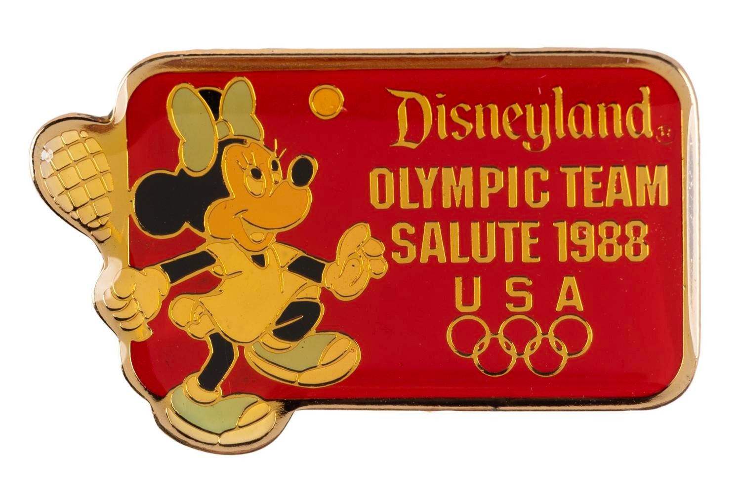 (Disneyland, 1988) A Disneyland Olympic Team Salute 1988 pin, featuring Minnie Mouse playing tennis. Measuring 1.25" wide, the pin is in very good condition with color shift from age.