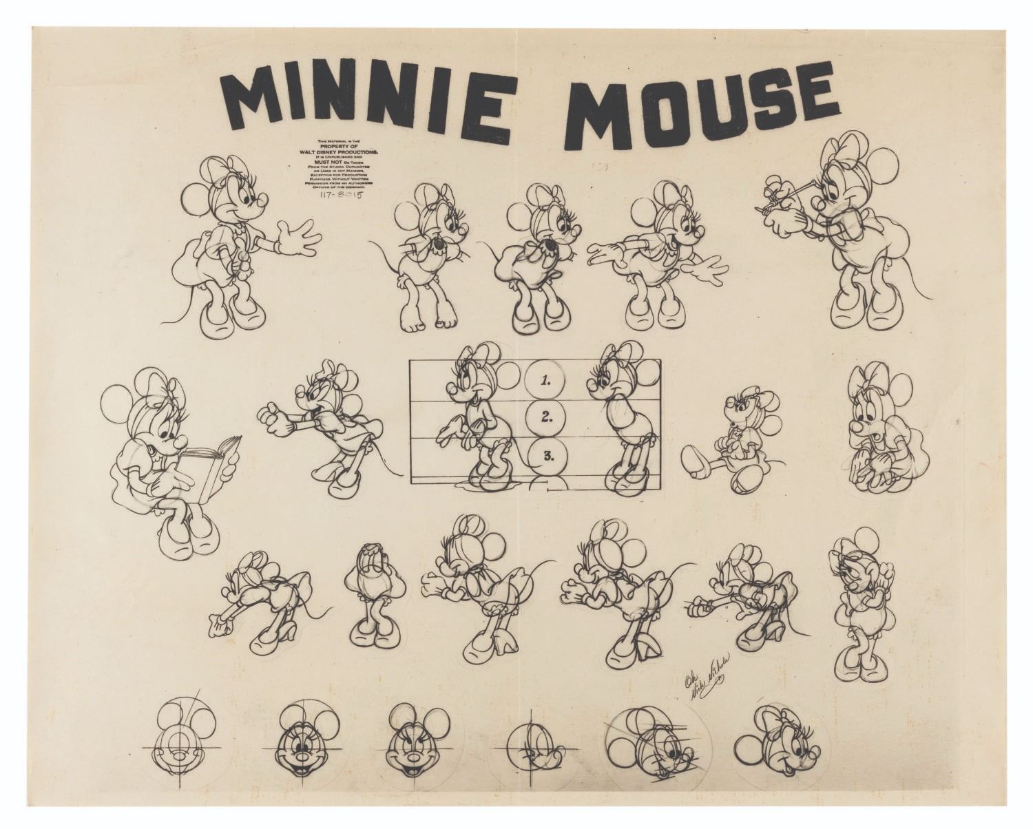 (Disney, 1950s-60s) A photostat model sheet of Minnie Mouse. The original was drawn in November 1947, with this piece likely printed in the 1950s or 1960s. Model sheets such as these were distributed to animators and crew to ensure character design continuity. Measuring 11.25” x 13.75”, the model sheet displays in good condition with light edge wear, creasing to the upper corners, a vertical fold in the center, and light discoloration from age.