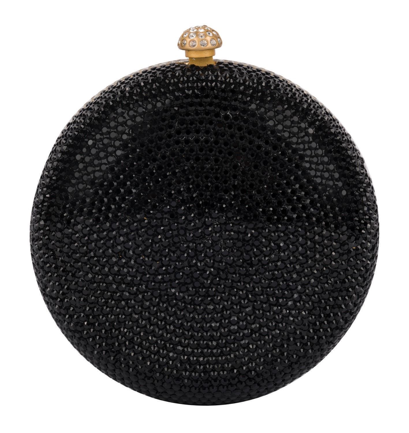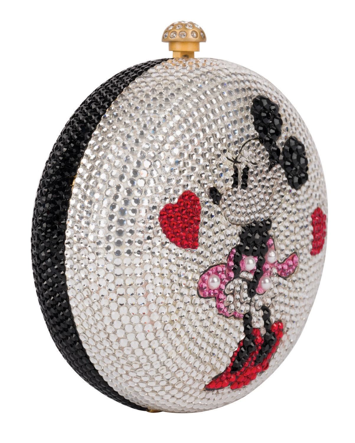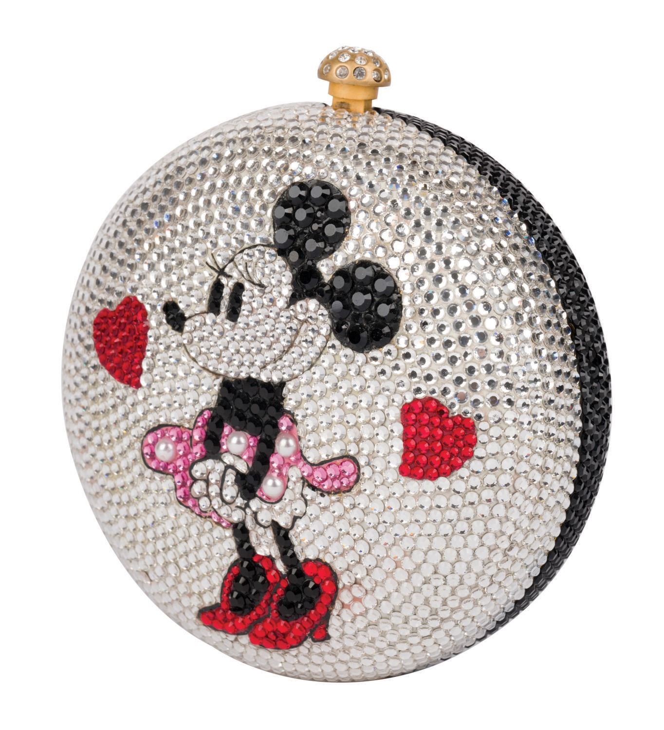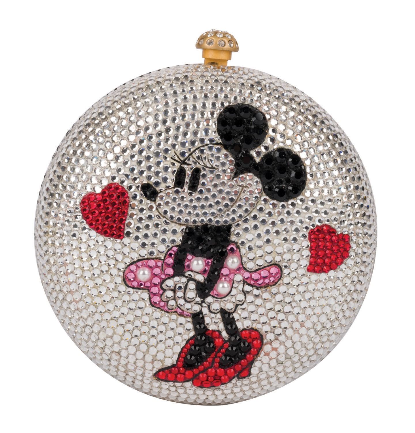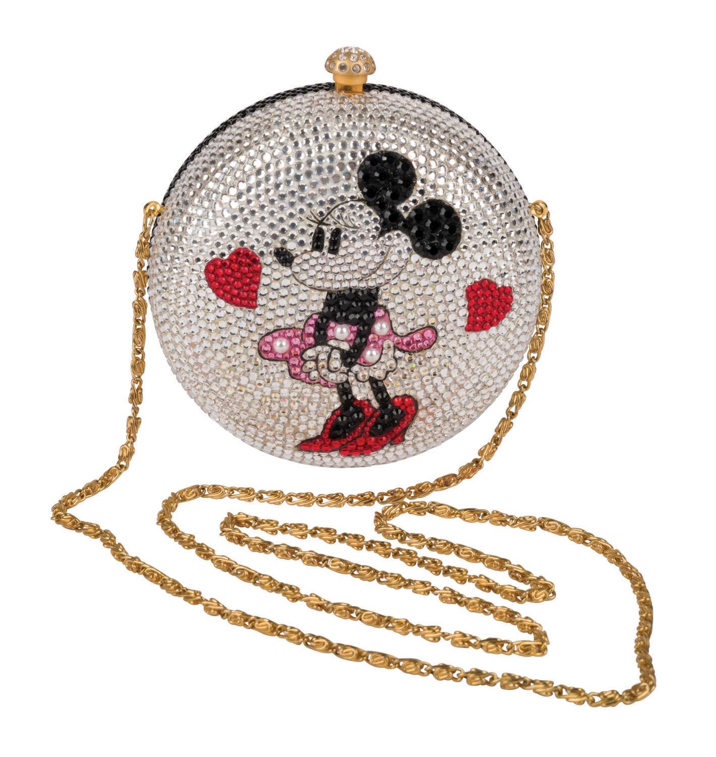 (Swarovski) A Minnie Mouse inspired hard-shell purse by Swarovski. The purse features Minnie Mouse in shimmering crystals and has a velvet interior. Measuring 5" in diameter, with a 44" chain, the purse is missing a few crystals but retains some additional white crystals and black crystals inside.