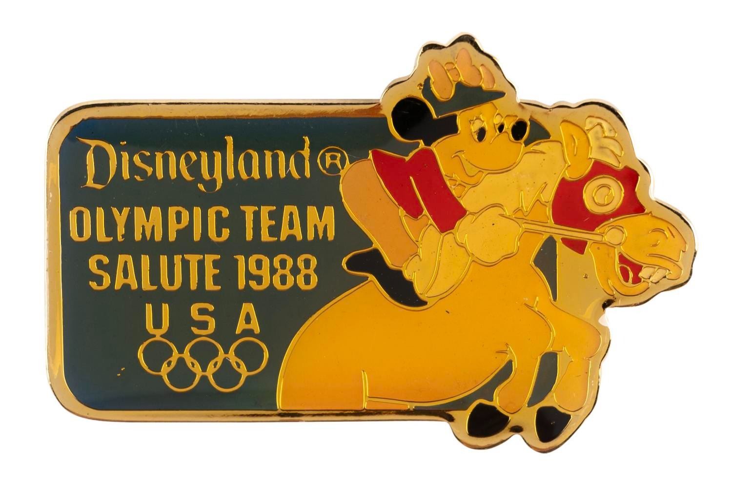 (Disneyland, 1988) A Disneyland Olympic Team Salute 1988 pin, featuring Minnie Mouse on horseback. Measuring 1.5" wide, the pin is in very good condition with color shift from age.