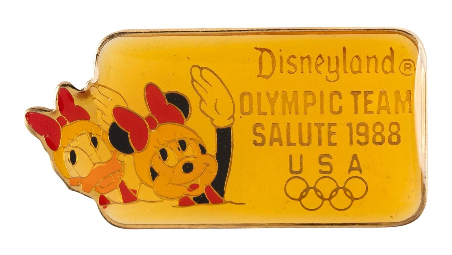 (Disneyland, 1988) A Disneyland Olympic Team Salute 1988 pin, featuring Minnie Mouse and Daisy Duck as synchronized swimmers. Measuring 0.75” x 1.25", the pin is in good condition with discoloration from age.