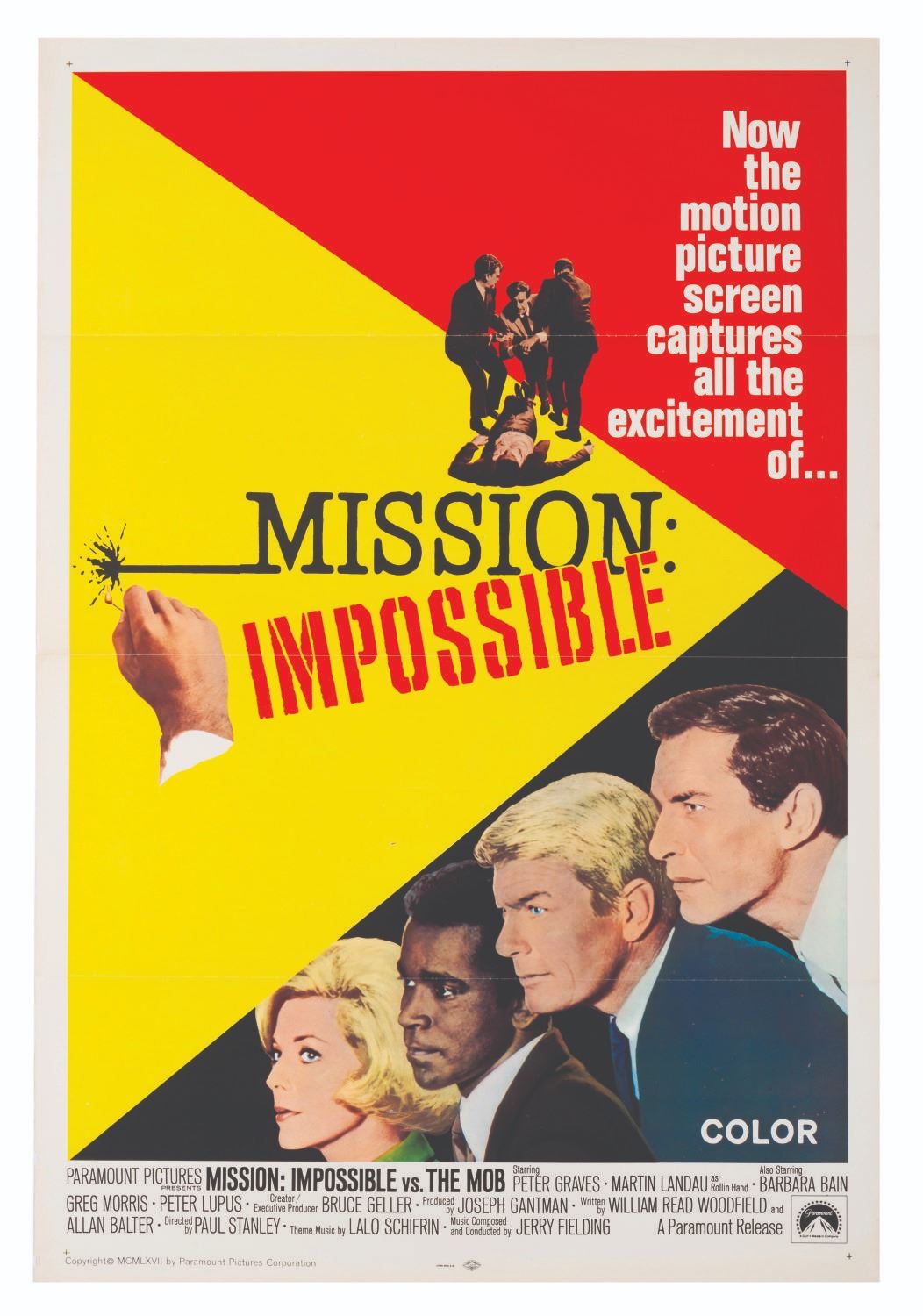 (Paramount, 1969) A one-sheet poster for the theatrical release of "Mission: Impossible vs. The Mob," a compilation of the two-part episode "The Council" from the original 1967 television series. Measuring 27” x 41”, the poster displays in good condition with light wear and two splits measuring 0.25” and 1” along the original folds, a very small tear 5” under the “O” in “IMPOSSIBLE,” light creasing and edge wear, and notations in ink and pencil on the reverse.