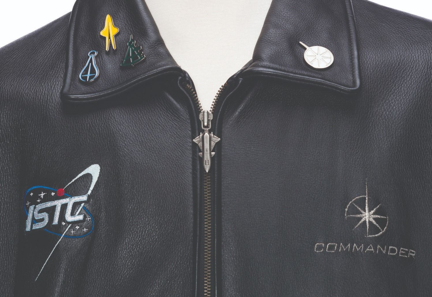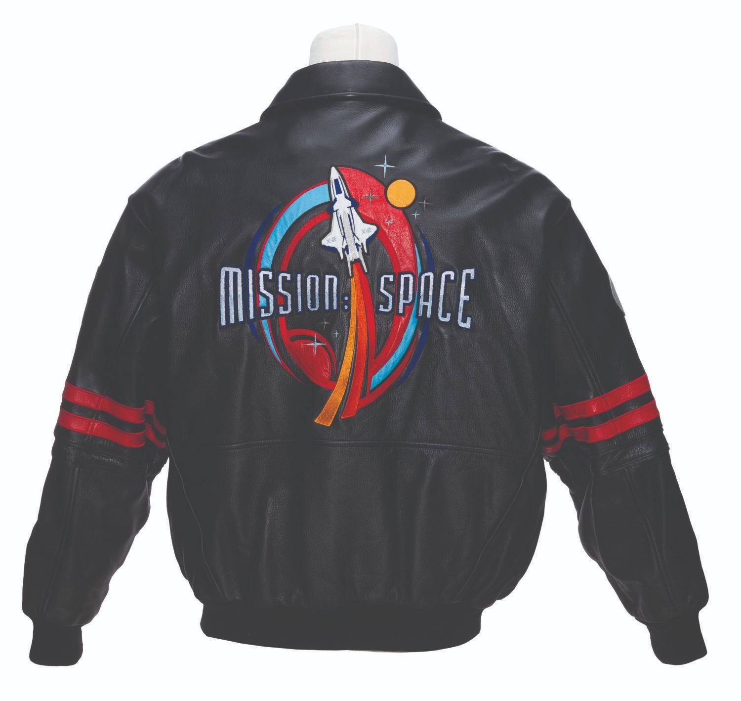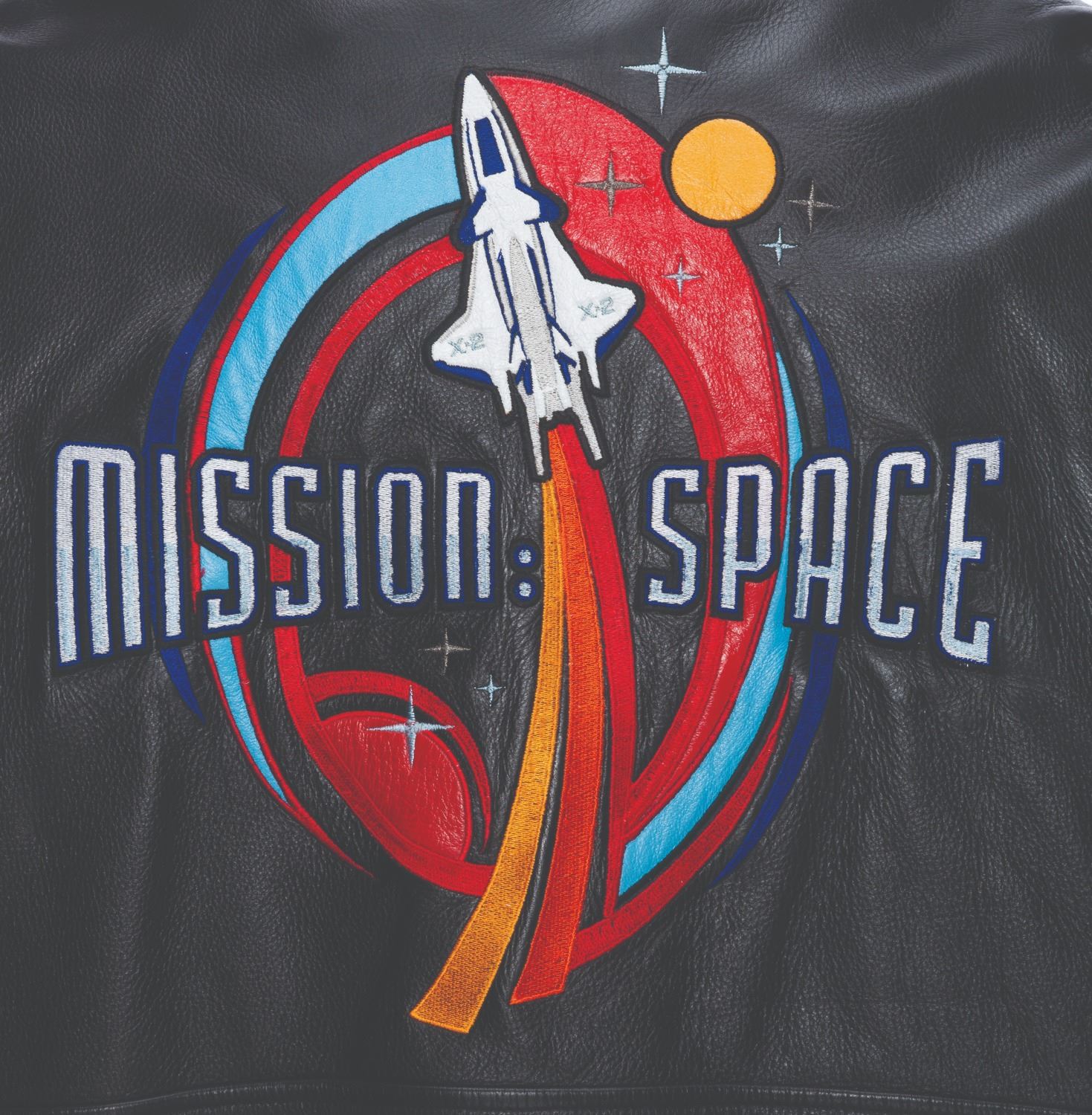 (Epcot, 2003) A Mission: SPACE leather jacket from the attraction's opening year at Walt Disney World. The jacket has “Commander” and ISTC (International Space Training Center) embroidered on the chest, four pins on the collar, patches on the sleeves, and a spaceship-shaped zipper. Labeled a size 2XL, the jacket is in very good condition with light scuffs, pilling, and wear.