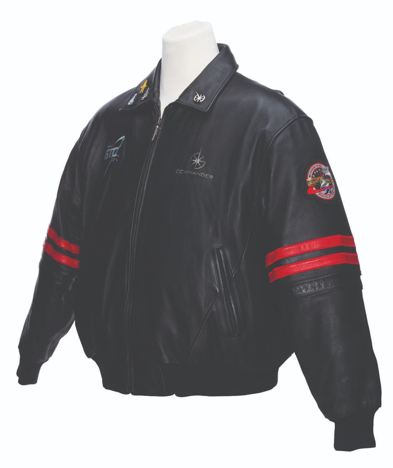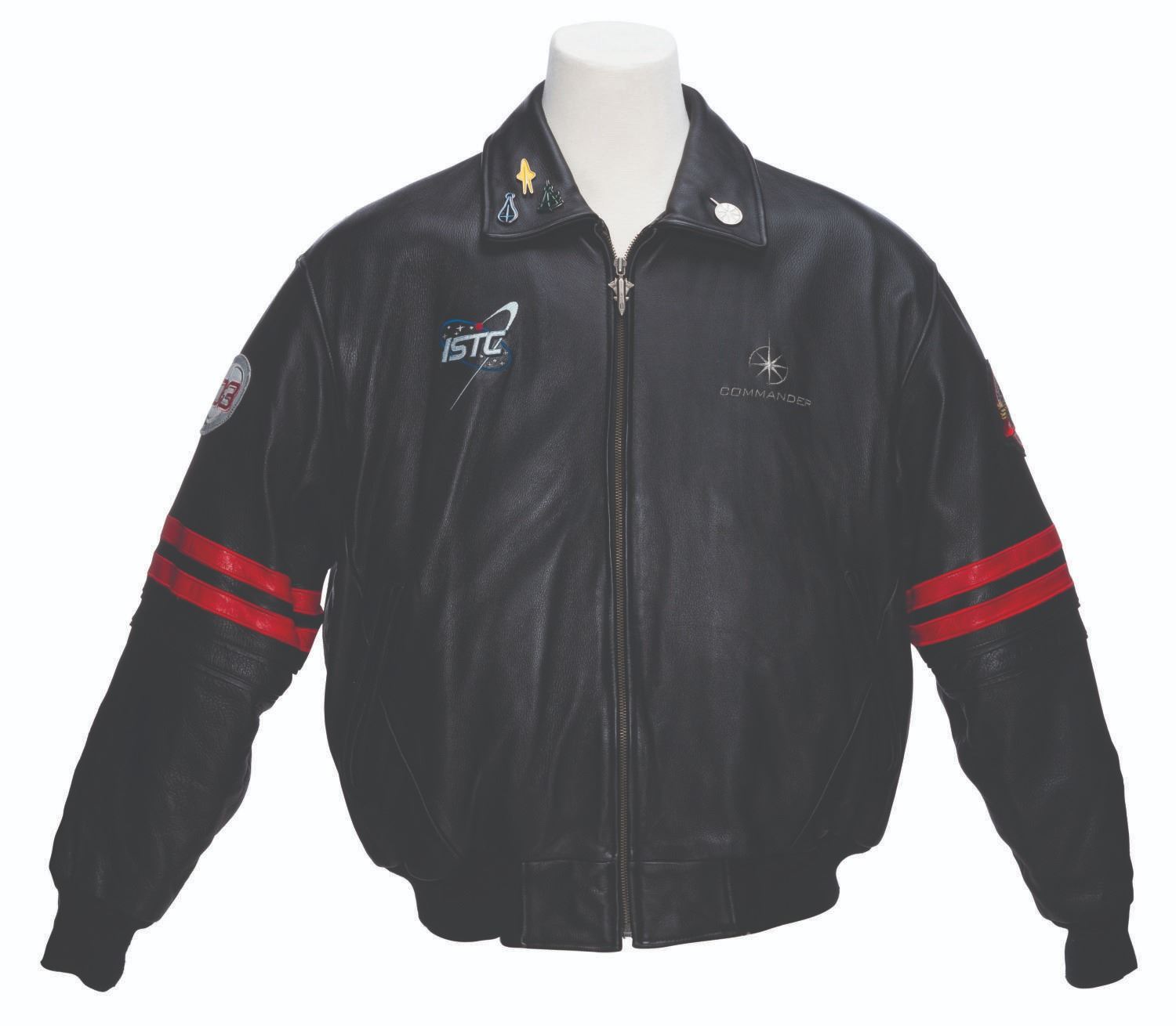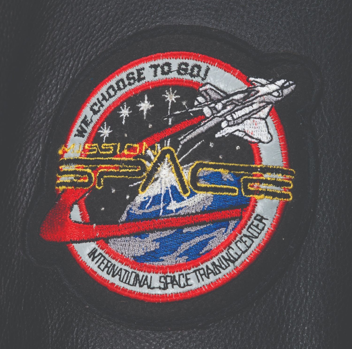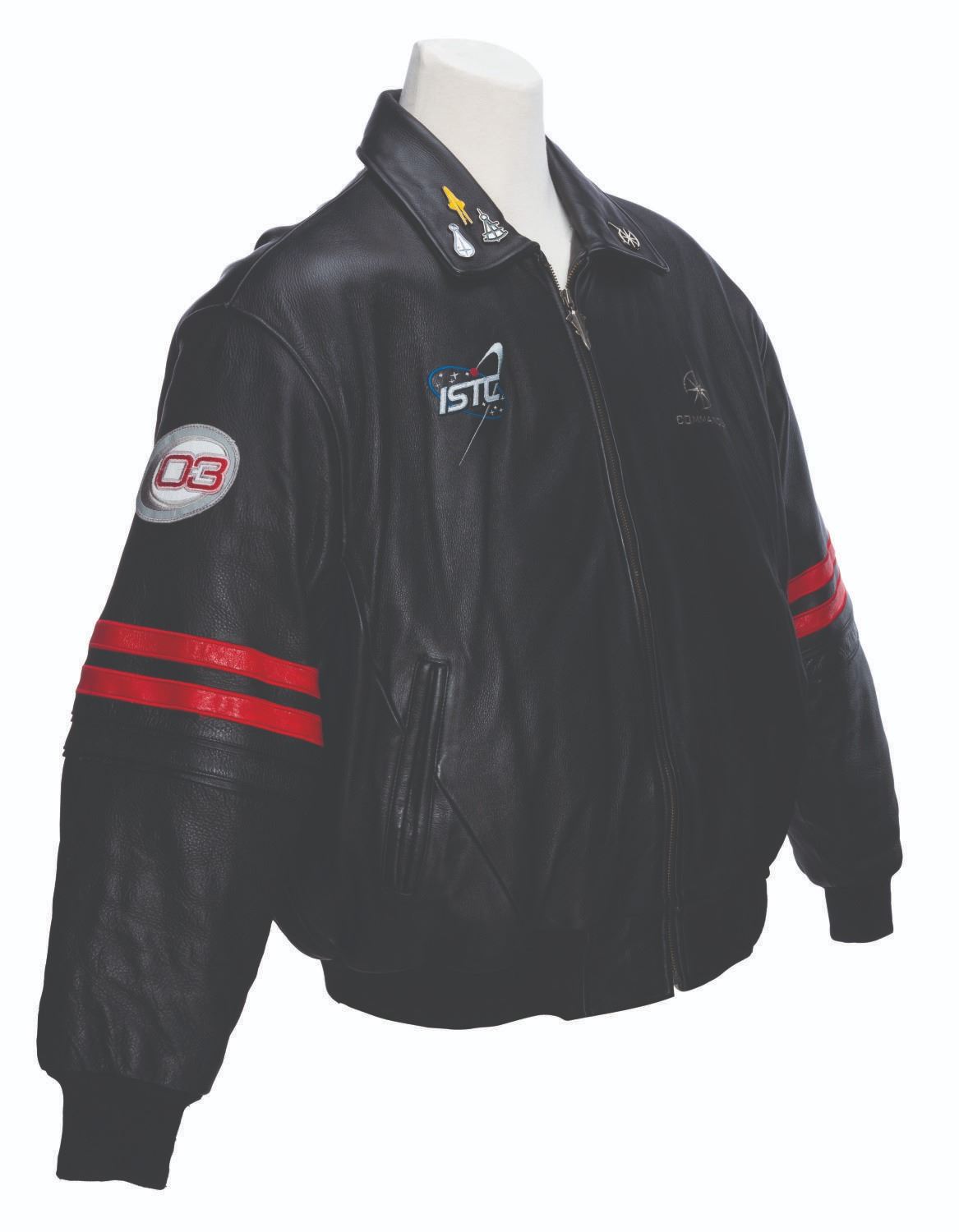 (Epcot, 2003) A Mission: SPACE leather jacket from the attraction's opening year at Walt Disney World. The jacket has “Commander” and ISTC (International Space Training Center) embroidered on the chest, four pins on the collar, patches on the sleeves, and a spaceship-shaped zipper. Labeled a size 2XL, the jacket is in very good condition with light scuffs, pilling, and wear.