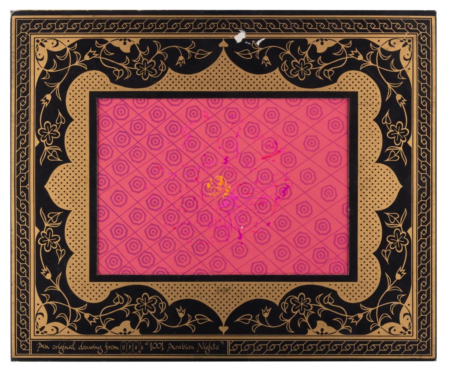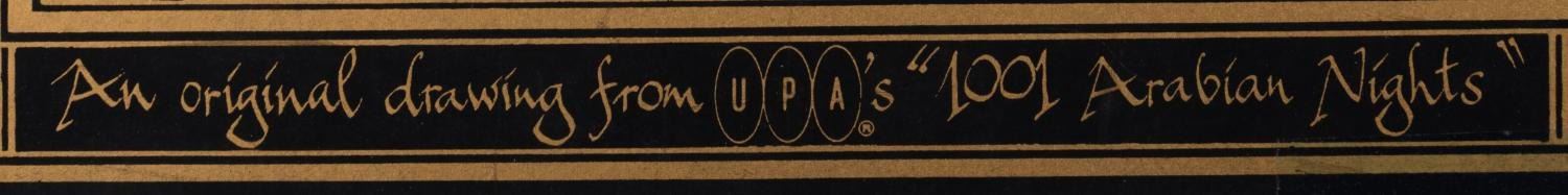 (UPA, 1959) A matte to display production art from UPA's "1001 Arabian Nights," which reads, "An original drawing from UPA's '1001 Arabian Nights'." Measuring 14" x 17" with a 7" x 10" opening, the matte is in good condition, with two spots of paper loss at the top center, and paint residue on the center back field.