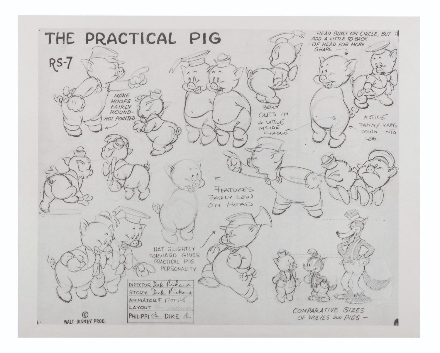 (Disney, 1939) A reproduction photostat model sheet from Silly Symphony short “The Practical Pig.” Model sheets such as these were distributed to animators and crew working on the film to ensure character design continuity. This sheet is a later, studio-produced copy of the short’s original photostat, likely from the 1970s-80s to be used as a reference for later productions. Measuring 10” x 12.5”, the model sheet is in good condition with light edge wear, a light vertical crease running through the center, and crease to the lower right corner.
