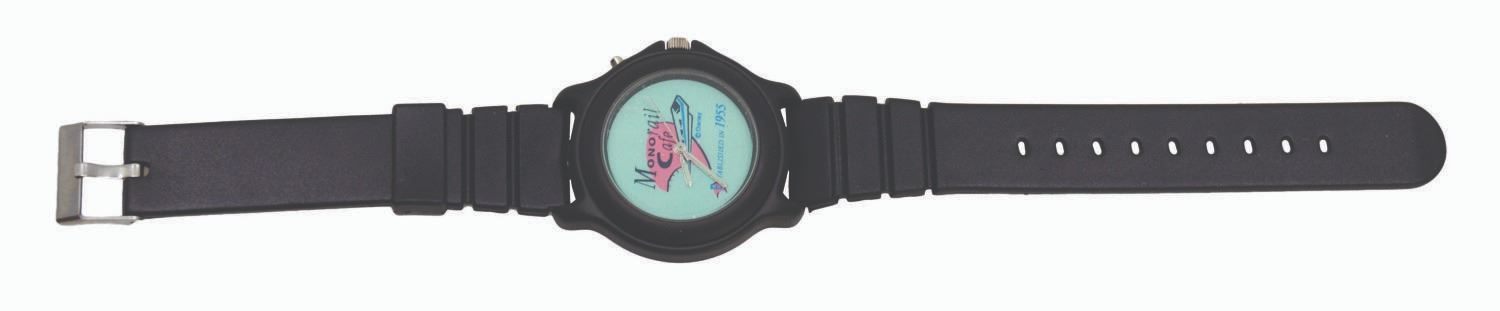 (Disneyland Hotel, 1999) A wristwatch manufactured by Becora that was released to commemorate the closing of the Disneyland Hotel's Monorail Cafe in 1999. The watch features a matte black metal case and bezel with a retro cafe logo on the face and a ribbed vinyl band. The crystal is still protected by the factory plastic cling. The piece is presented in its collector's tin branded with the original Monorail Cafe logo and retains the original warranty sheet. The case measures 1.5" in diameter and the band is 9.5" long. The watch is in fine condition with minimal wear except for some slight stickiness to the band from natural off-gassing of the medium. The tin measures 2.5"x5.75" and has some scratching to the lid.