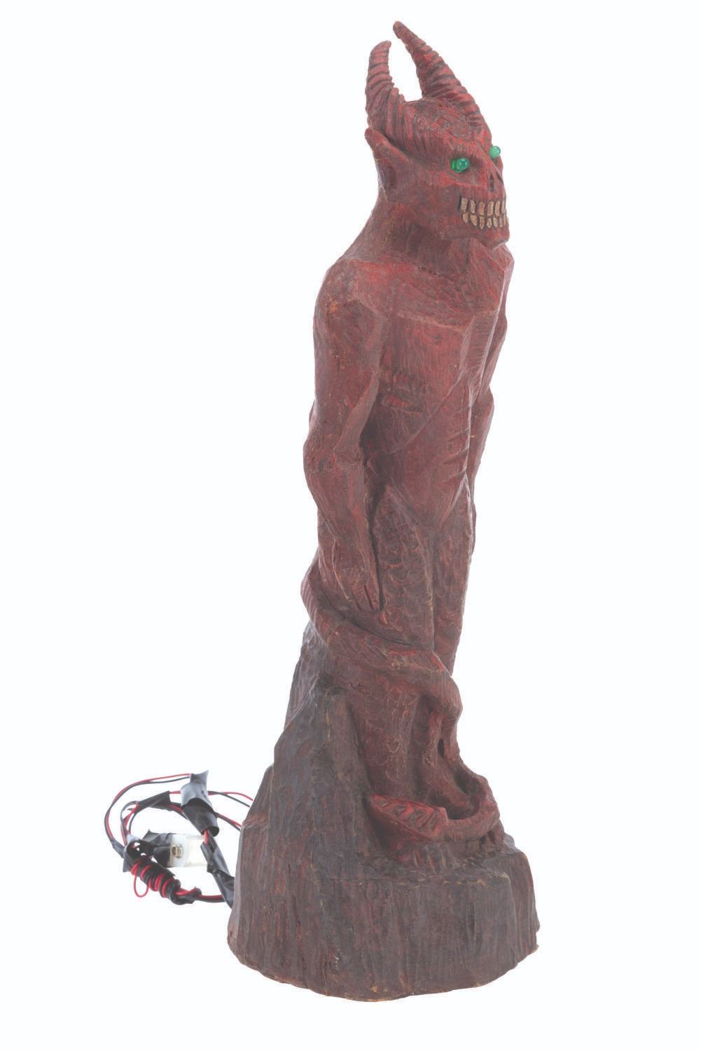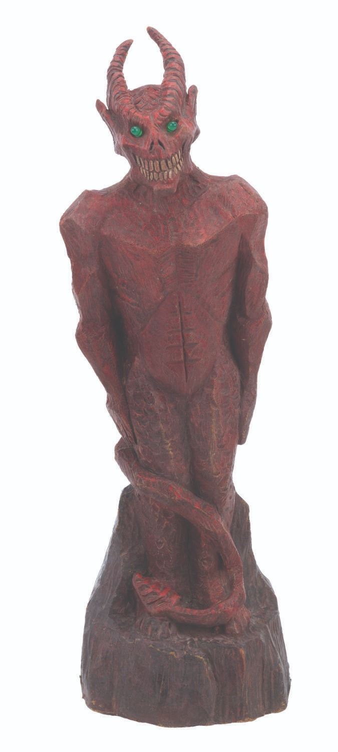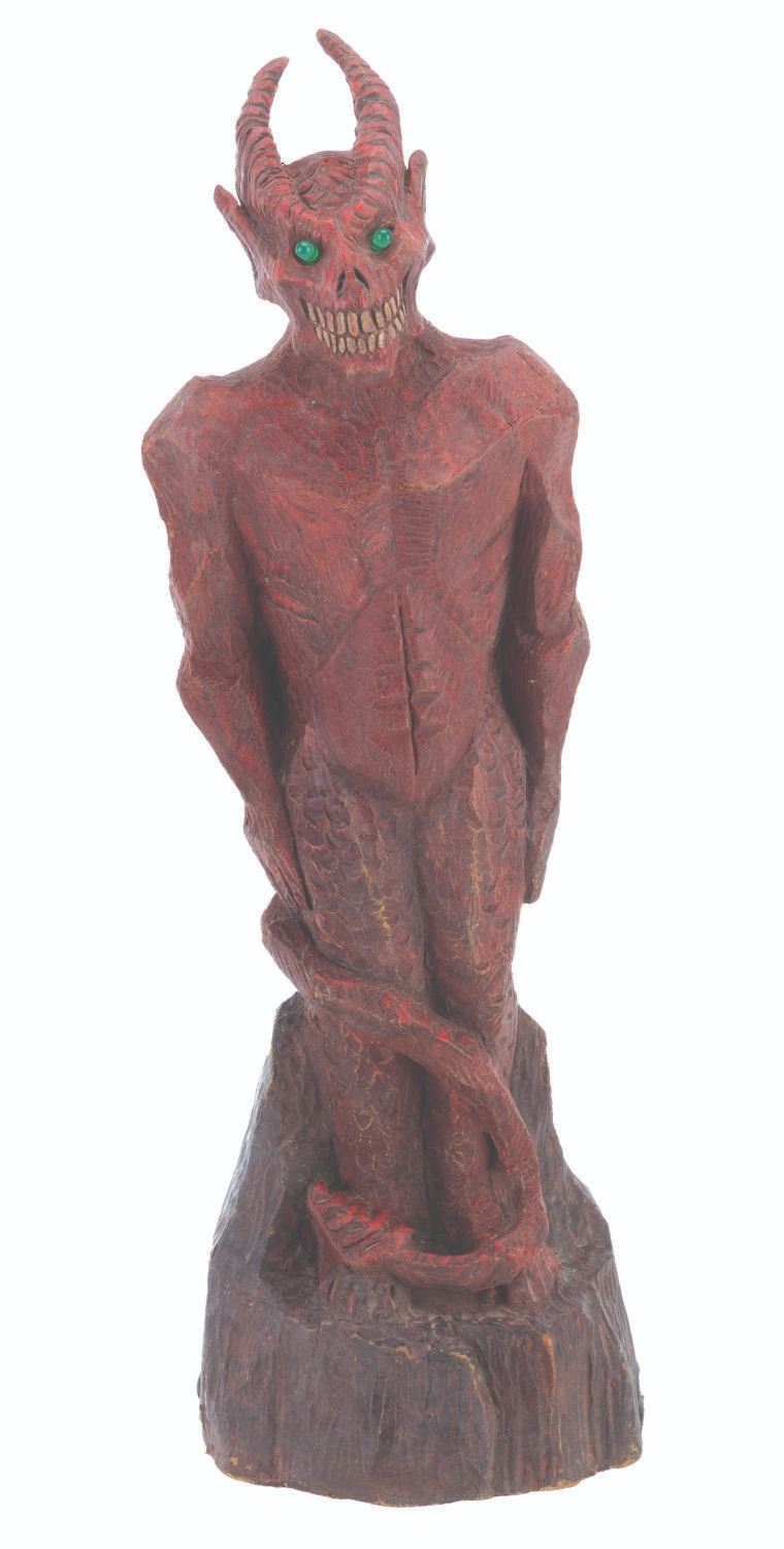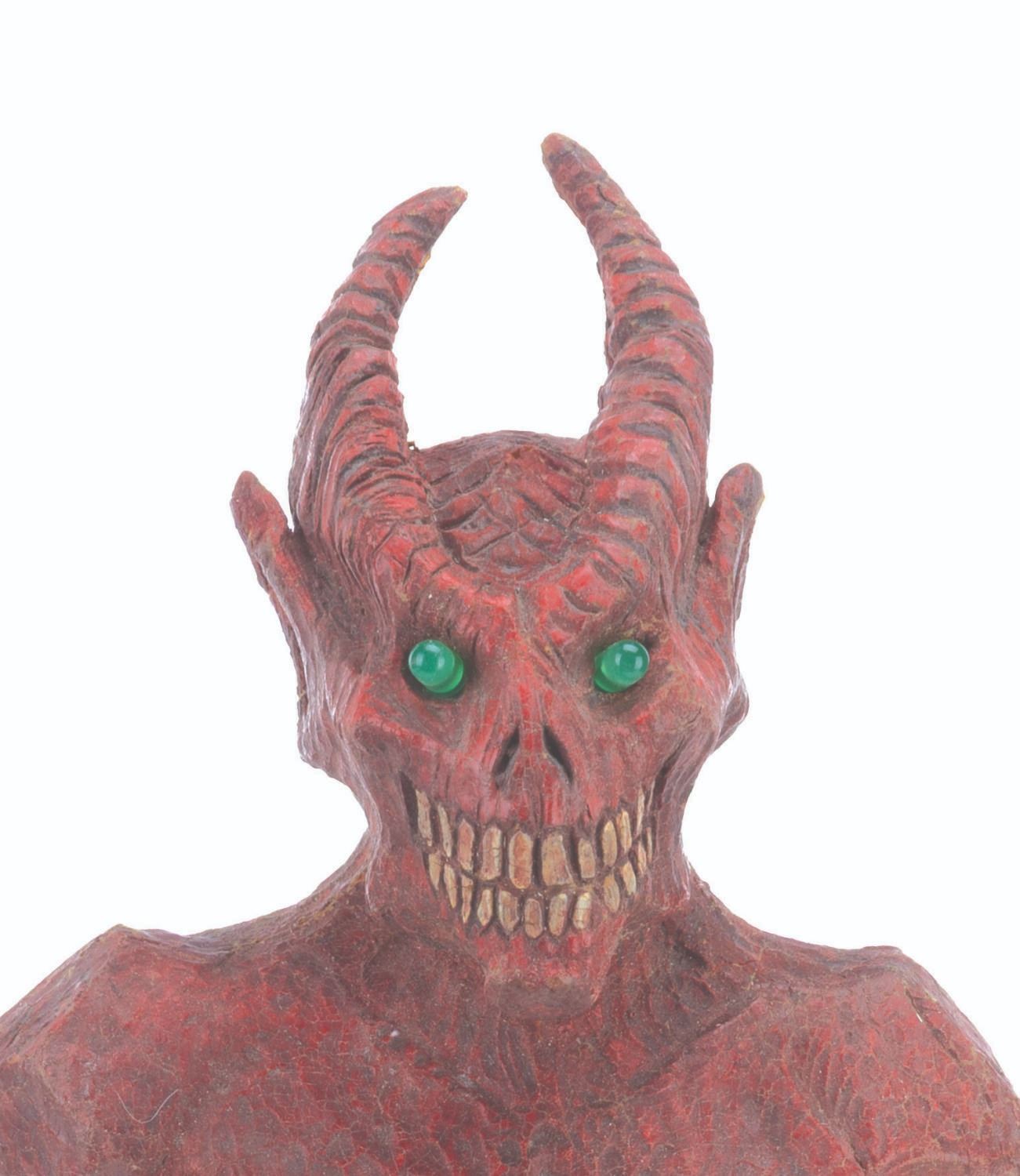 (Laurel Entertainment, 1991) An original screen-used demon statue prop sculpted by Stephen Chiodo for the anthology horror series “Monsters.” This prop appears in the third-season episode “Hostile Takeover,” in which a business executive employs literal voodoo economics to become even richer. However, he ultimately kills a voodoo priestess and faces the wrath of Satan himself. The prop’s light-up function did not work when tested. Measuring 17.5” tall and 5.5” in diameter, the hand-painted foam statue is in very good condition, with typical wear from production use and age, including spots of paint loss, cracks, and scuffs.