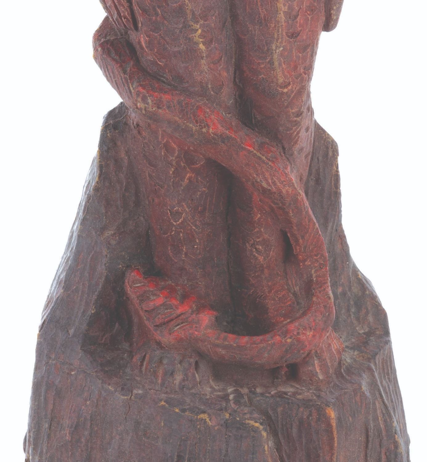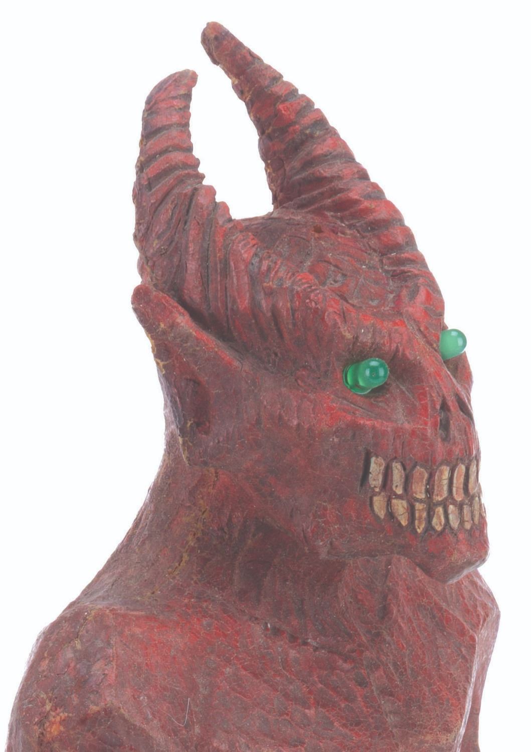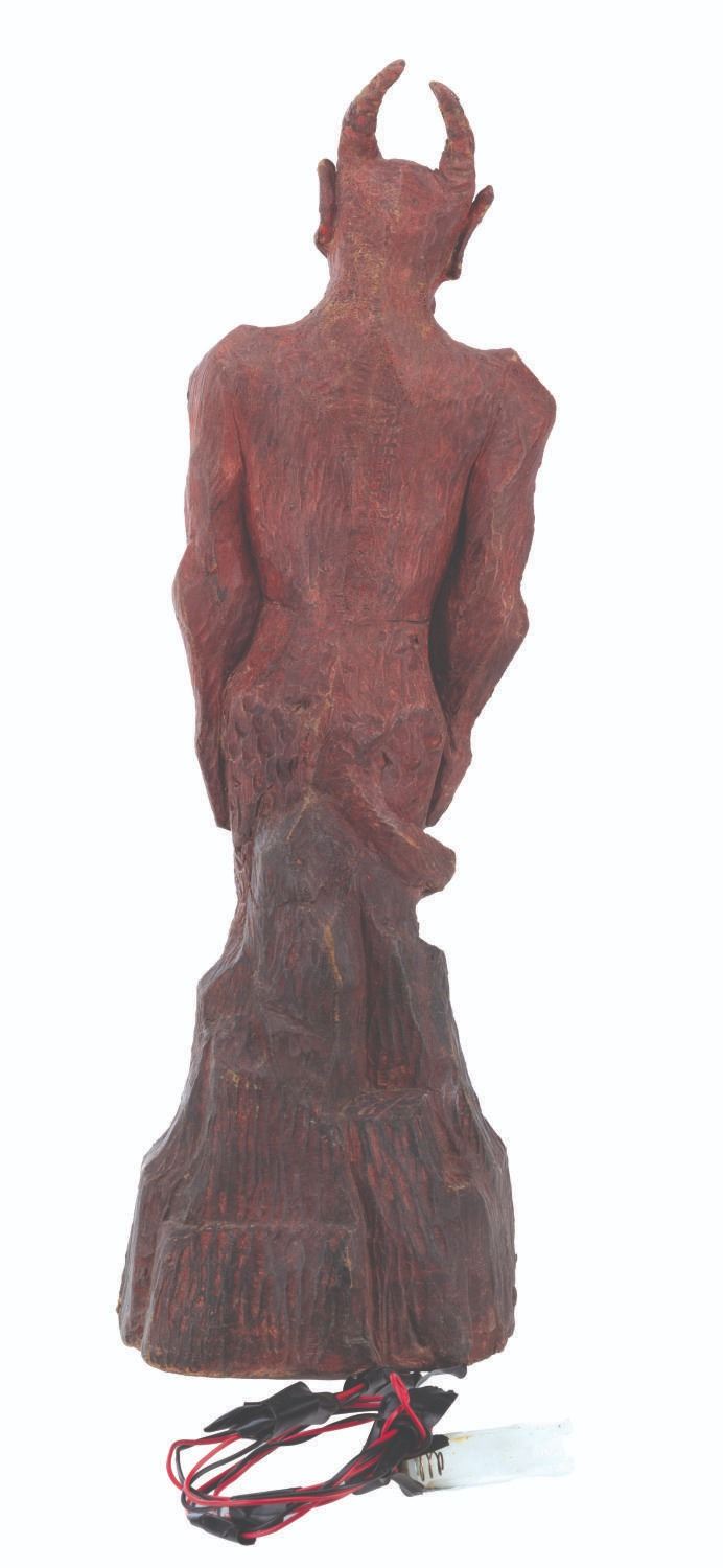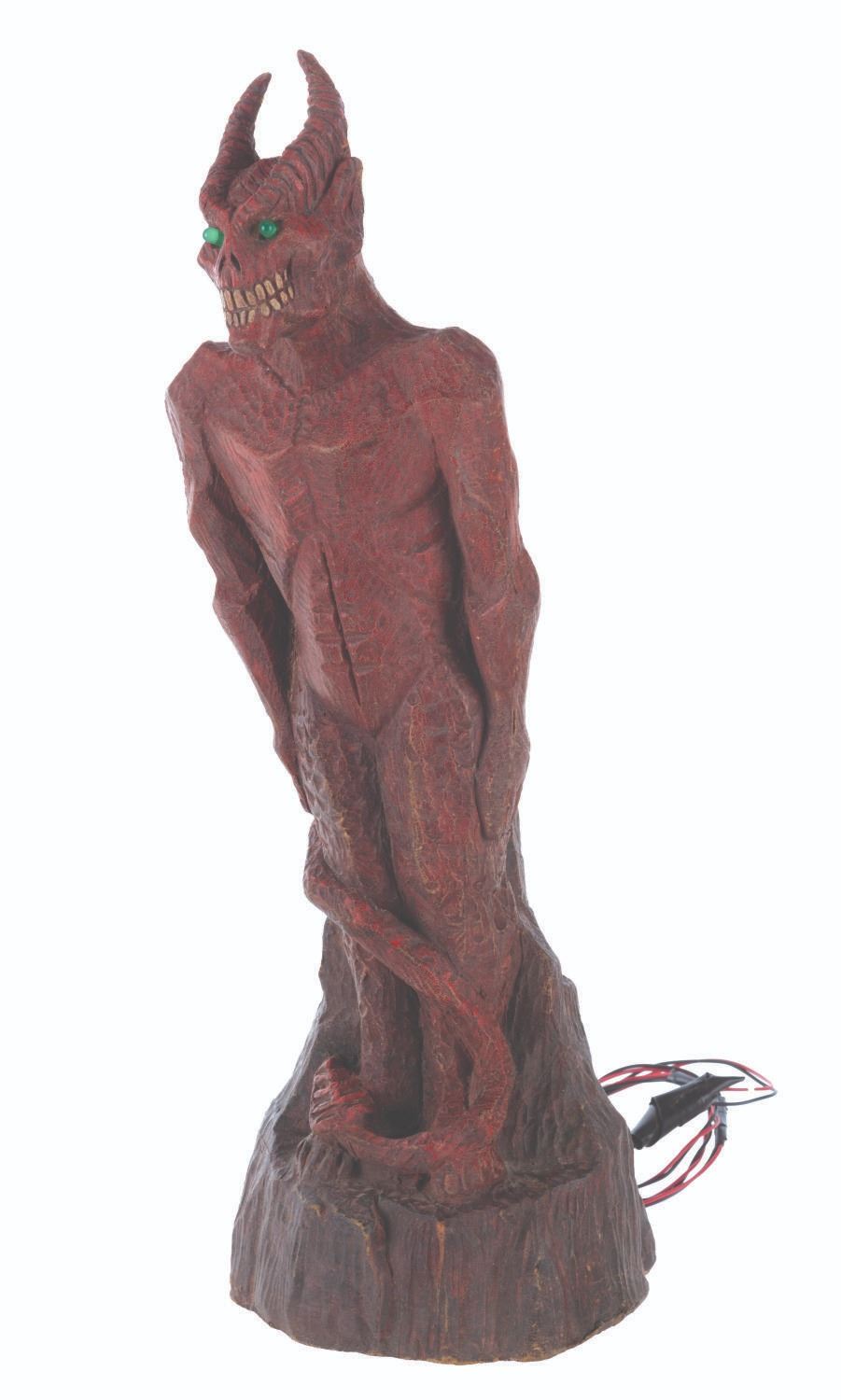 (Laurel Entertainment, 1991) An original screen-used demon statue prop sculpted by Stephen Chiodo for the anthology horror series “Monsters.” This prop appears in the third-season episode “Hostile Takeover,” in which a business executive employs literal voodoo economics to become even richer. However, he ultimately kills a voodoo priestess and faces the wrath of Satan himself. The prop’s light-up function did not work when tested. Measuring 17.5” tall and 5.5” in diameter, the hand-painted foam statue is in very good condition, with typical wear from production use and age, including spots of paint loss, cracks, and scuffs.