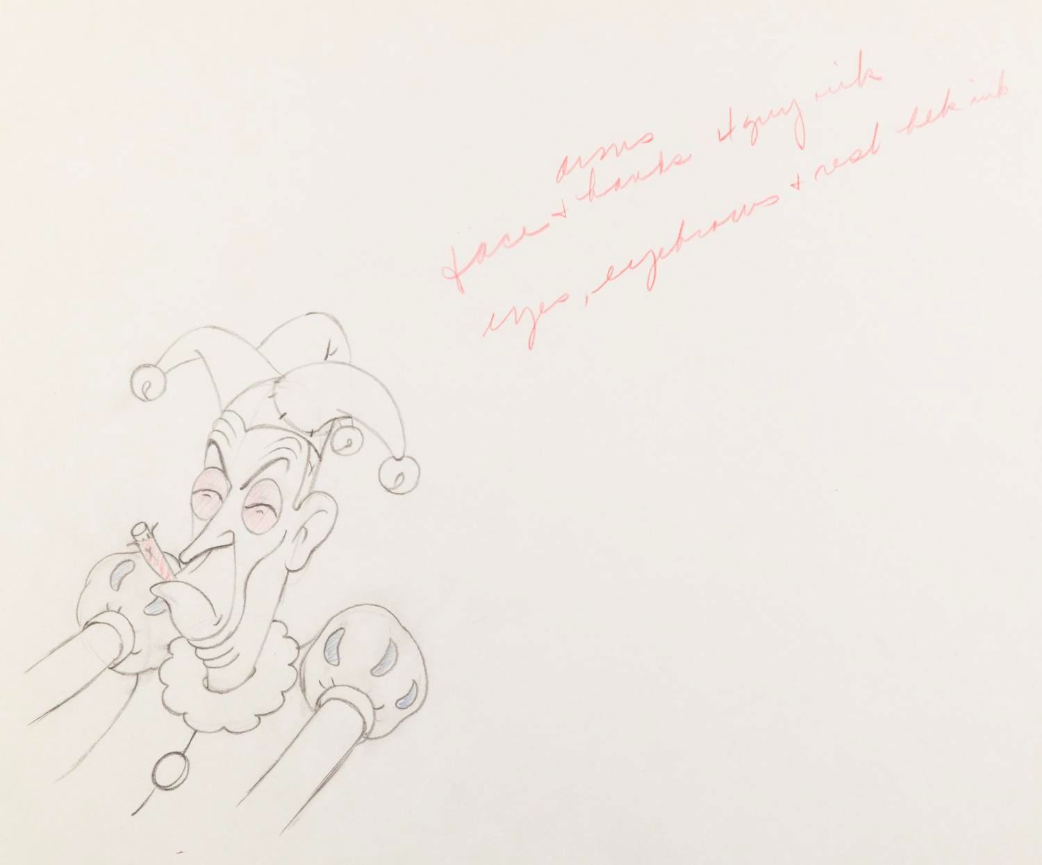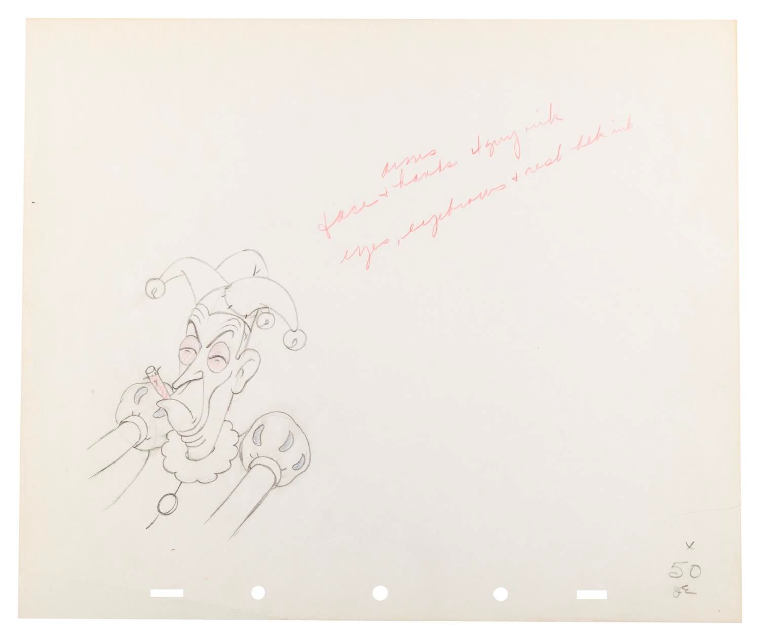 (Disney, 1938) An original production drawing of Ned Sparks as a court jester from the Silly Symphony short "Mother Goose Goes Hollywood. " Sparks has an image size of 4 " x 5 " on 10 " x 12 " animation paper. The drawing is in very good condition with light creasing and discoloration.