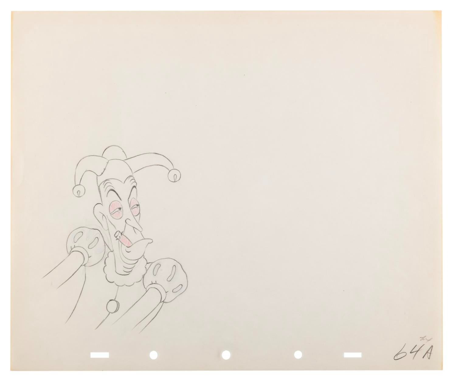 (Disney, 1938) An original production drawing of Ned Sparks as a court jester from the Silly Symphony short "Mother Goose Goes Hollywood." With a character image size of 4" x 5" on 10" x 12" animation paper, the graphite and colored pencil art is in very good condition with light creases and discoloration from age.