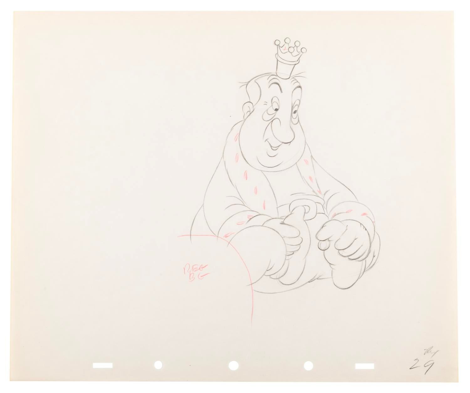 (Disney, 1938) An original production drawing of Hugh Herbert as Old King Cole from the Silly Symphony short "Mother Goose Goes Hollywood. " With an image size of 5 " x 7 " on 10 " x 12 " animation paper, the graphite and colored pencil drawing is in very good condition with light creases and discoloration from age.