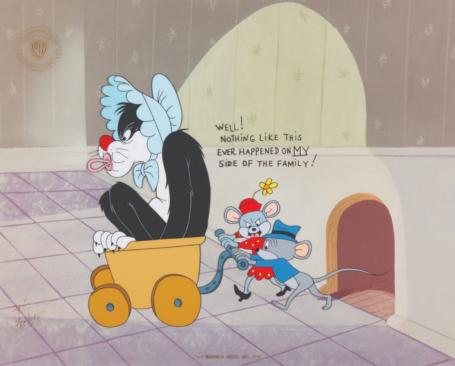 (Warner Bros., 1992) A hand-painted limited edition cel titled"Mouse Divided." This cel is numbered 42 of 750 and has been hand-signed signed by animation legend Friz Freleng. The cel measures 13.5"x16.5"and is in very good condition, however, Freleng's signature is severely faded.