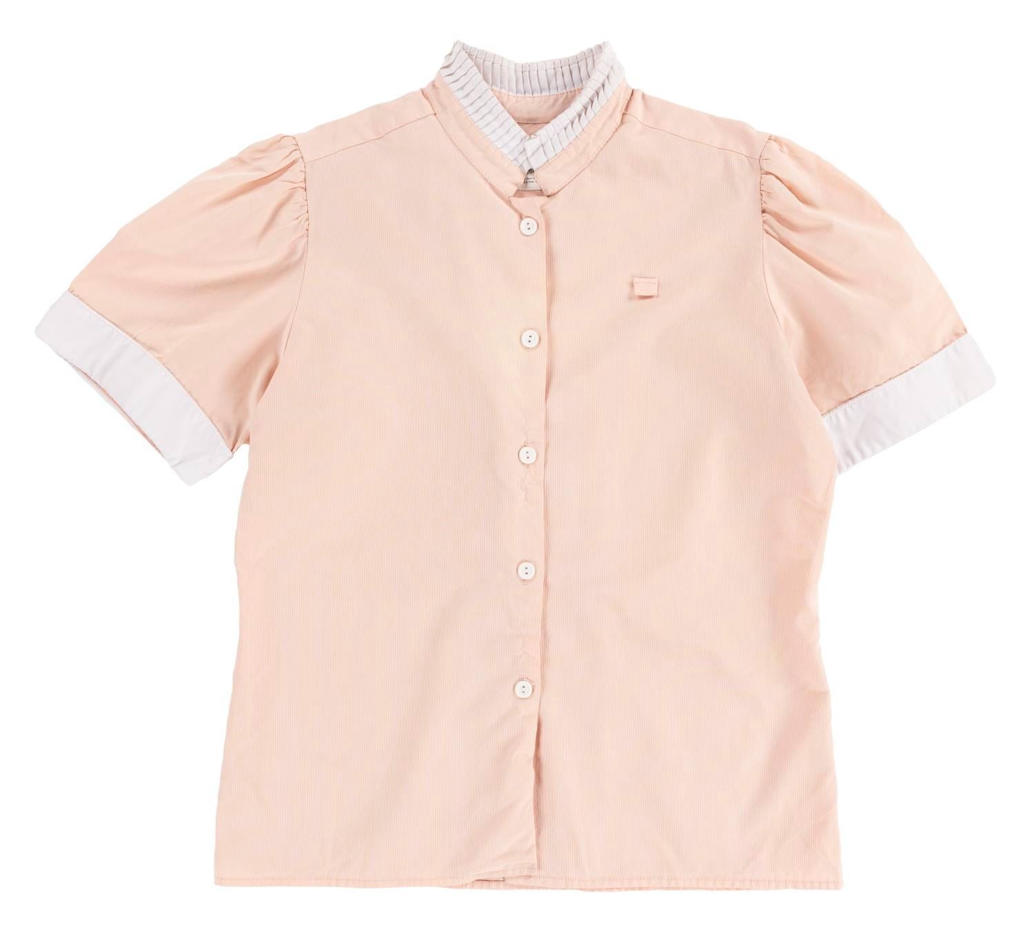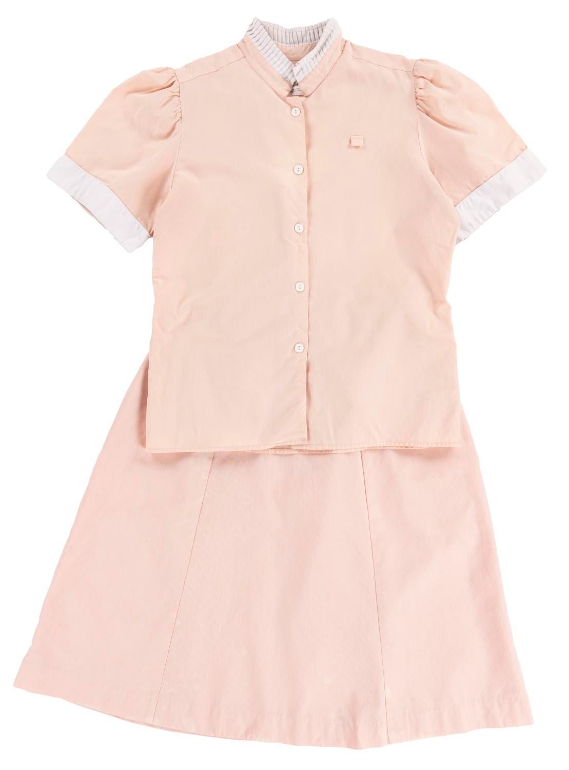 (Walt Disney World, 2000s) A Mousekeeping coral pink shirt and skirt worn by a Cast Member. Mousekeepers are those who keep the Resort's hotel rooms clean for Guests. Labeled a size Female 16, the shirt is in very good condition with light wear, while the skirt is labeled a size Female 16x28 and is in fair condition with stains, wear, and a tear.