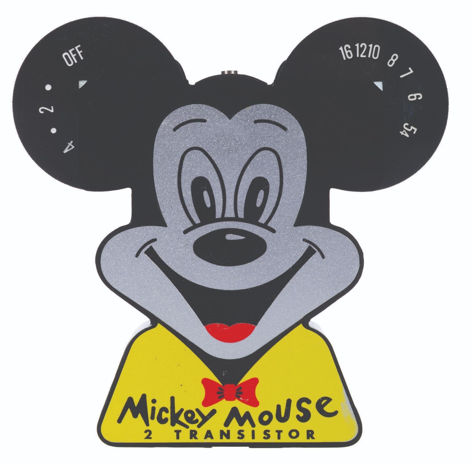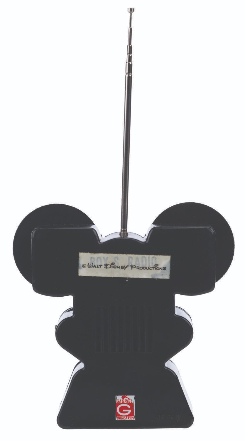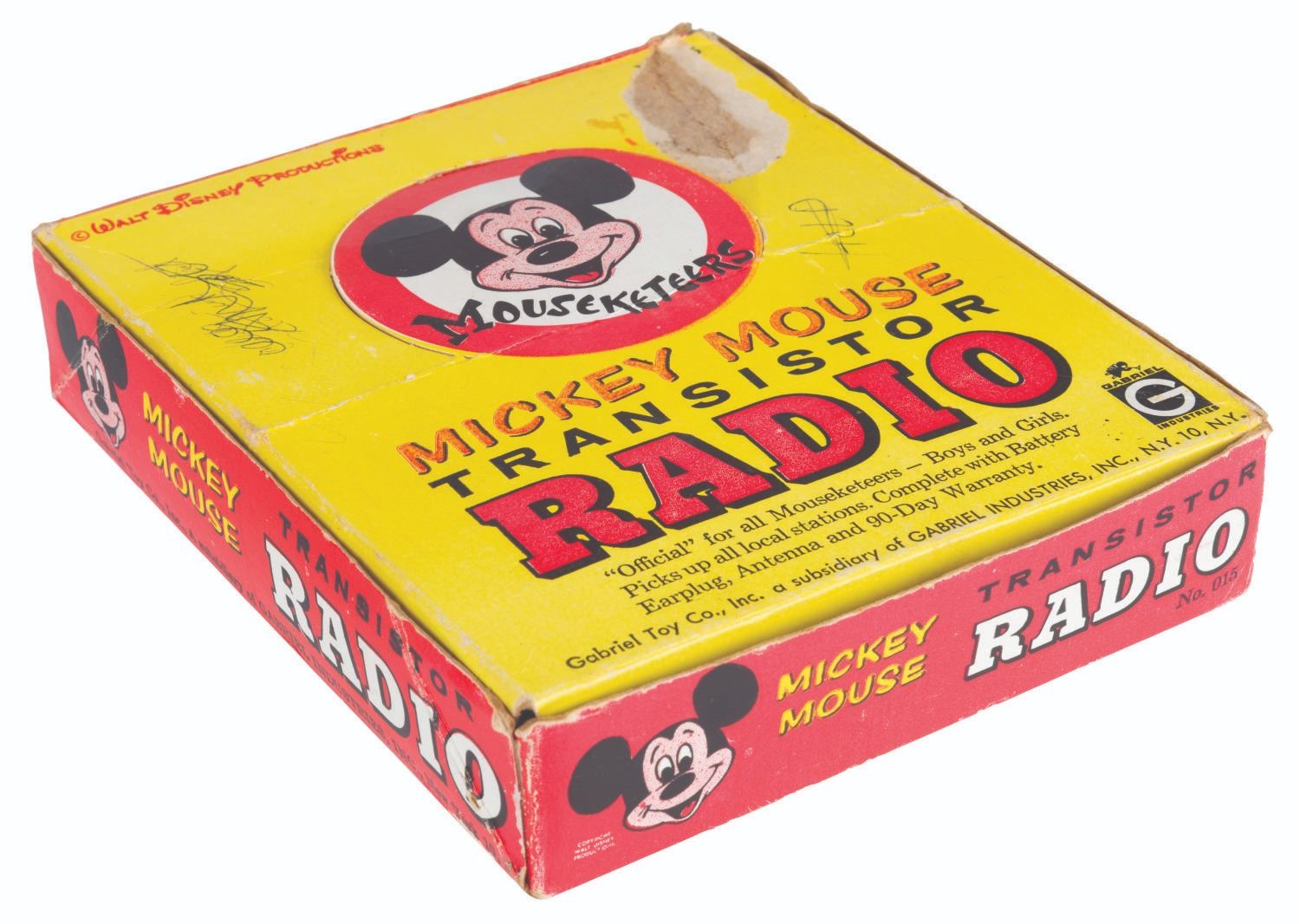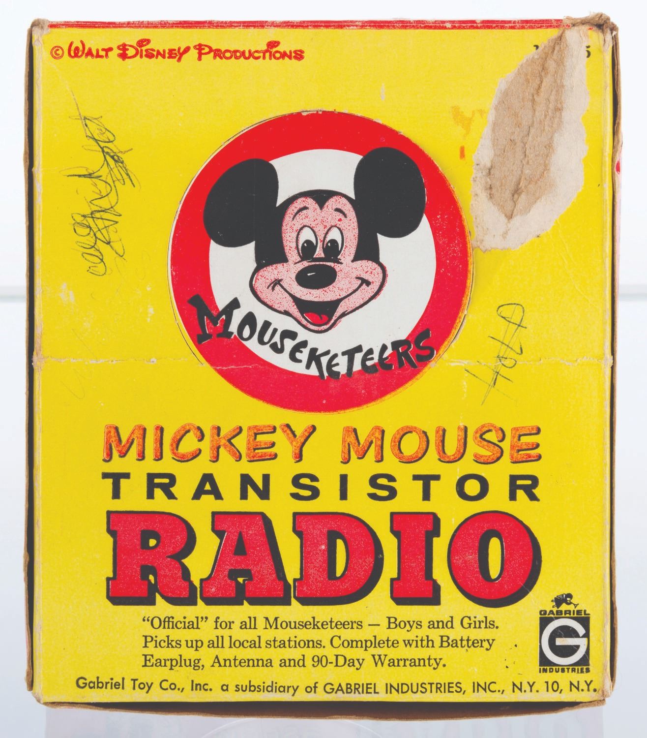 (Gabriel Toy Co., 1960s) An Official Mouseketeers Mickey Mouse AM transistor radio with the original box, earplug, battery, and detachable antenna. The radio powered on when tested, but needs servicing to function properly. Measuring 4.75” x 5” x 1” thick, the radio displays in good condition with light scuffs. The 6” x 7” x 1.5” tall box displays in fair condition with heavy wear throughout, writing in pen and grease pencil on the top and bottom, tape residue stains inside, and a 2” x 1” area of paper loss to the top right corner.