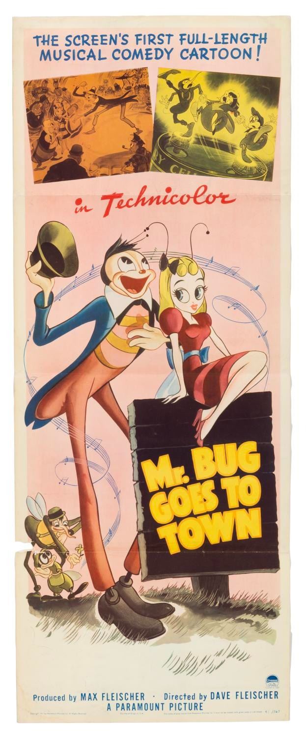 (Paramount, 1941) An insert poster for Fleischer Studios second animated feature "Mr. Bug Goes to Town. " Measuring 14 " x 36 " the poster is in good condition with light discoloration, soiling, staining, edge wear, creasing and a 1.5 " tear along a fold line on the lower left edge.