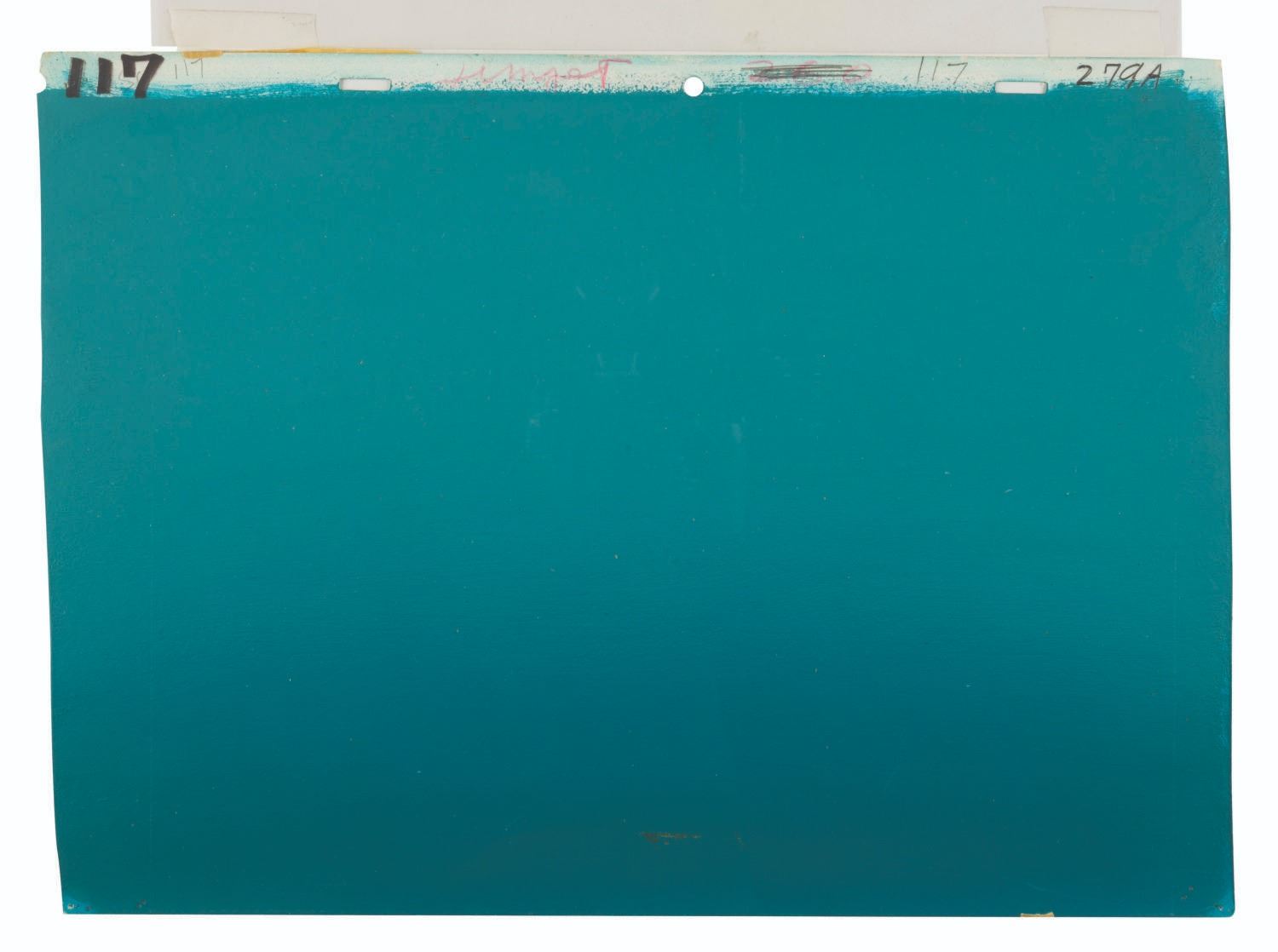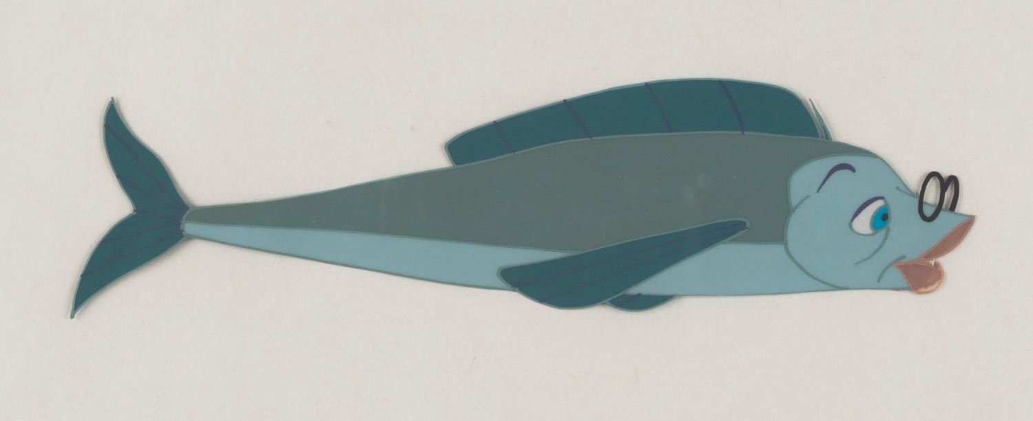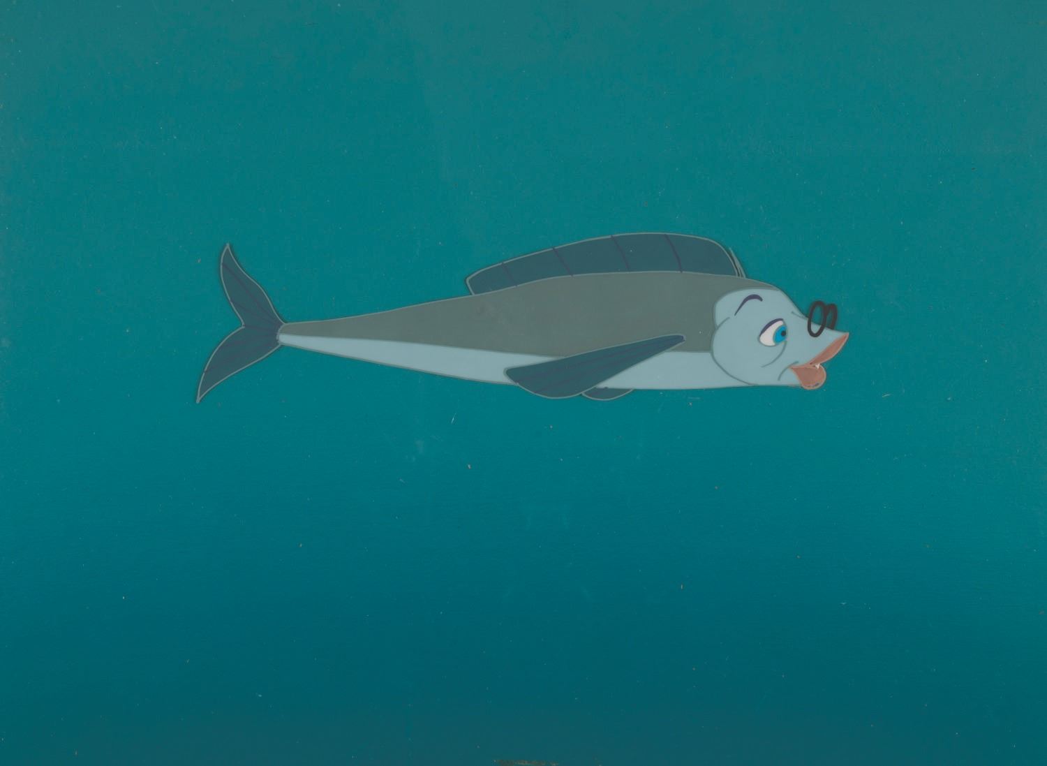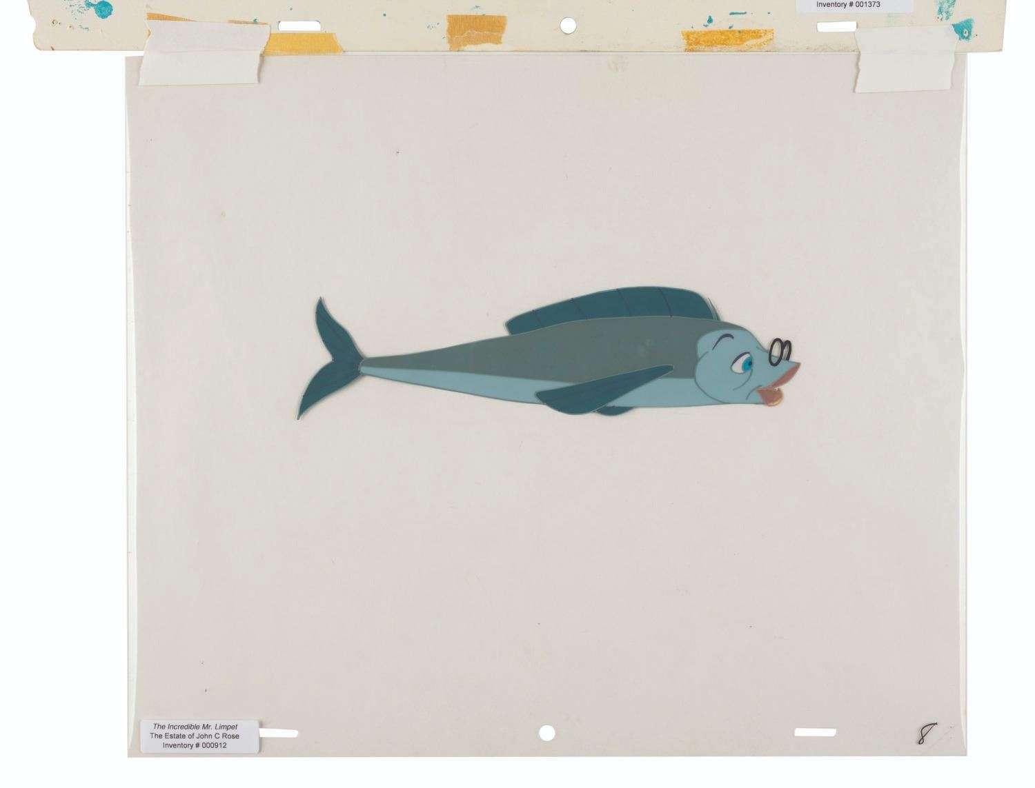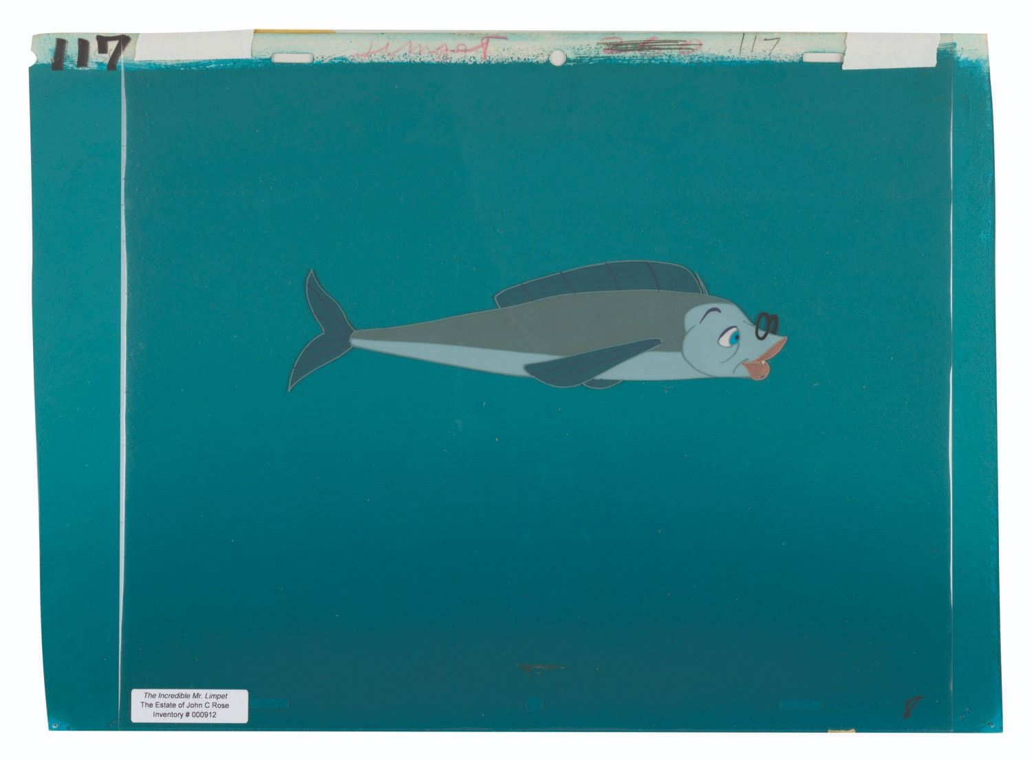 (Warner Bros., 1964) An original production cel and background setup from the Warner Bros. Studios live-action and animated film, "The Incredible Mr. Limpet." Featuring Mr. Limpet realizing that he might be considered a hero for his work, just before he starts to daydream, the hand-painted cel is paired with an extremely rare hand-painted background from the film. With a character image size measuring 2” x 7.5” and 10.5” x 14” overall, the piece is in very good condition with minor paint loss on Limpet's lips, tape adhesive in a small area on the background, and pinholes on the background from production use.