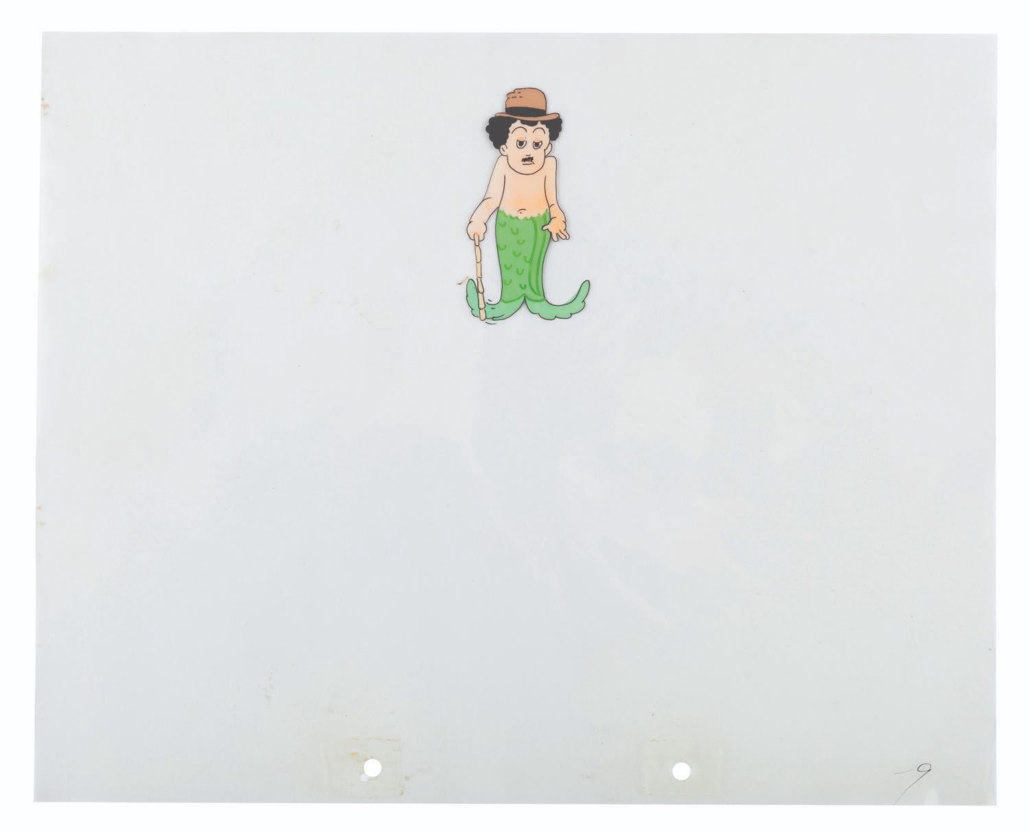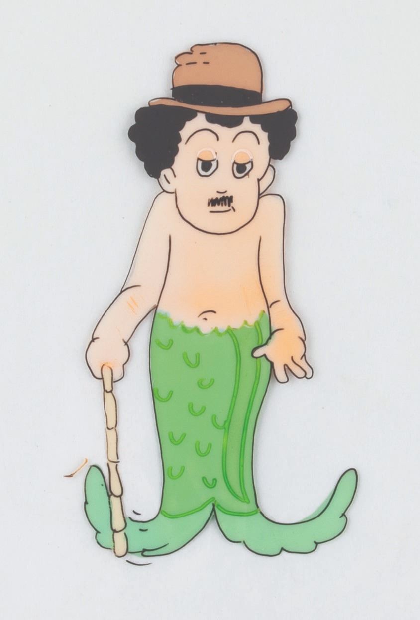 (Schlesinger, 1935) An original hand-painted production cel of Charlie Chaplin as a mermaid from the Merrie Melodies short “Mr. and Mrs. is the Name.” With an image size of 1.5” x 3” on a 10” x 12.5” cel, the art is in good condition with spots of paint loss and scratches.