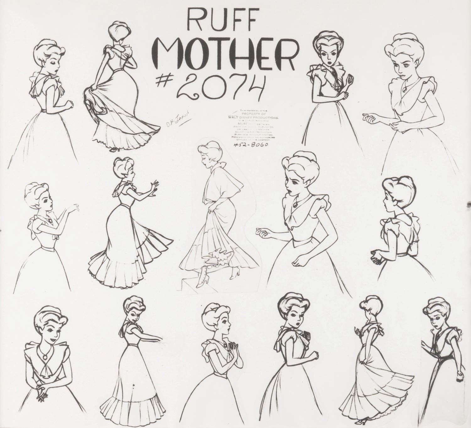 (Disney, 1952) A Studio-produced photostat model sheet of Mrs. Darling for the 1953 feature film, "Peter Pan." Model sheets such as these were distributed to animators and crew working on the film to ensure character design continuity. This sheet is dated April of 1952 and the visible image measures 10.75" x 11.75" within a 19” x 18” frame. The model sheet is in very good condition with light waviness to the right edge.